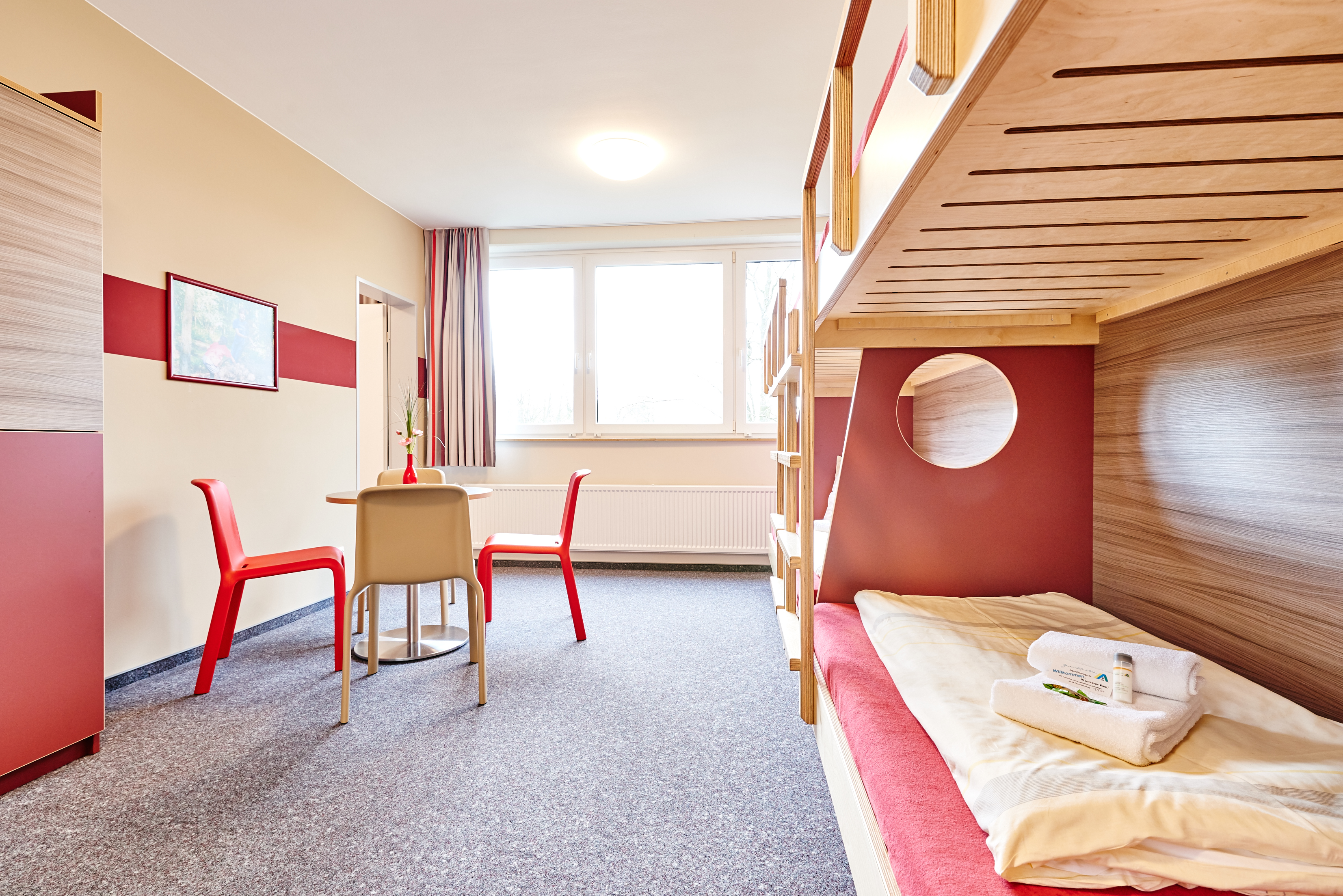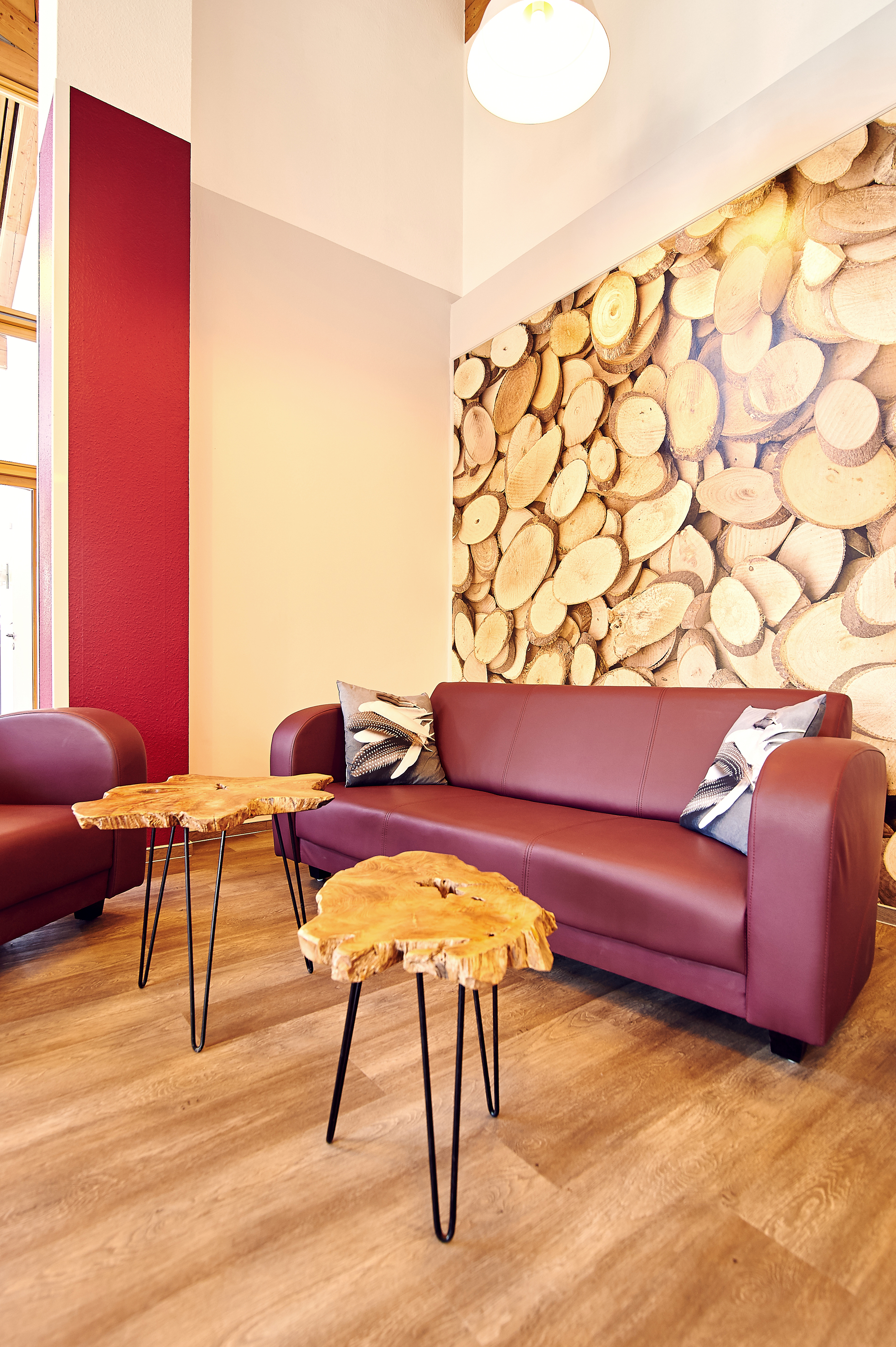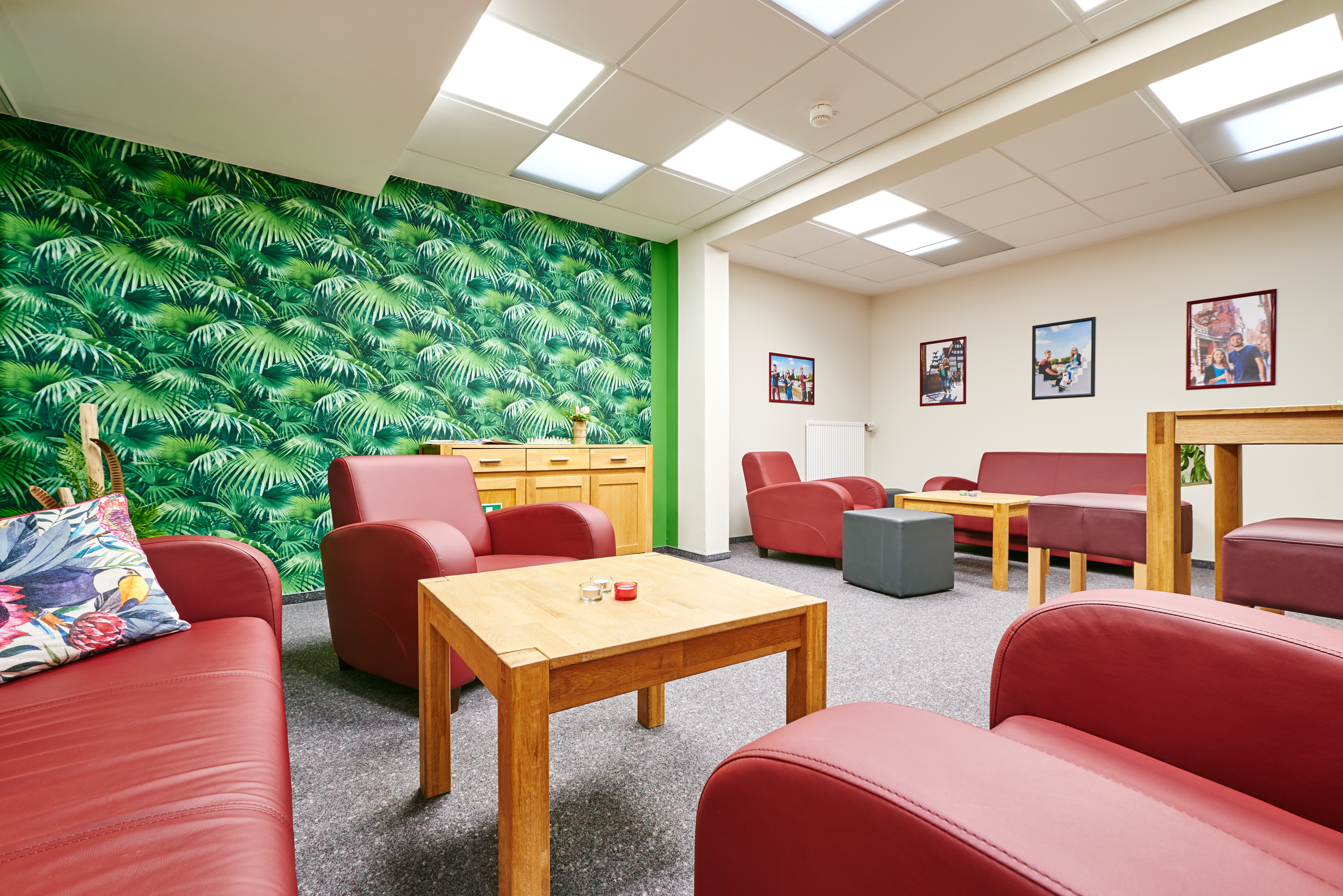 In der Jugendherberge Rotenburg selbst hat sie zu kräftigeren Farben gegriffen. Dort sind die Wände in tiefes Grün und Rot getaucht. Rot habe ich verwendet, weil die Farbe im Haus bereits eingesetzt wurde‘, erklärt die Innengestalterin. Und Grün funktioniert hier wunderbar als Komplementärfarbe.‘ Da sie beruhigend wirken soll, kommt die Farbe beispielsweise in der Lehrer-Lounge zum Einsatz, kombiniert mit warmen Rot- und Lilatönen. And der Wand: eine große Fototapete im Dschungel-Design. Florale Bilder sind dieses Jahr im Trend, das ist aber nicht der einzige Grund. Ich versuche immer, einen Bezug zur Natur herzustellen.‘ Die Rattan- und Holzmöbel aus dem Bestand passen dazu und kommen im neugestalteten Raum jetzt viel besser zur Geltung.