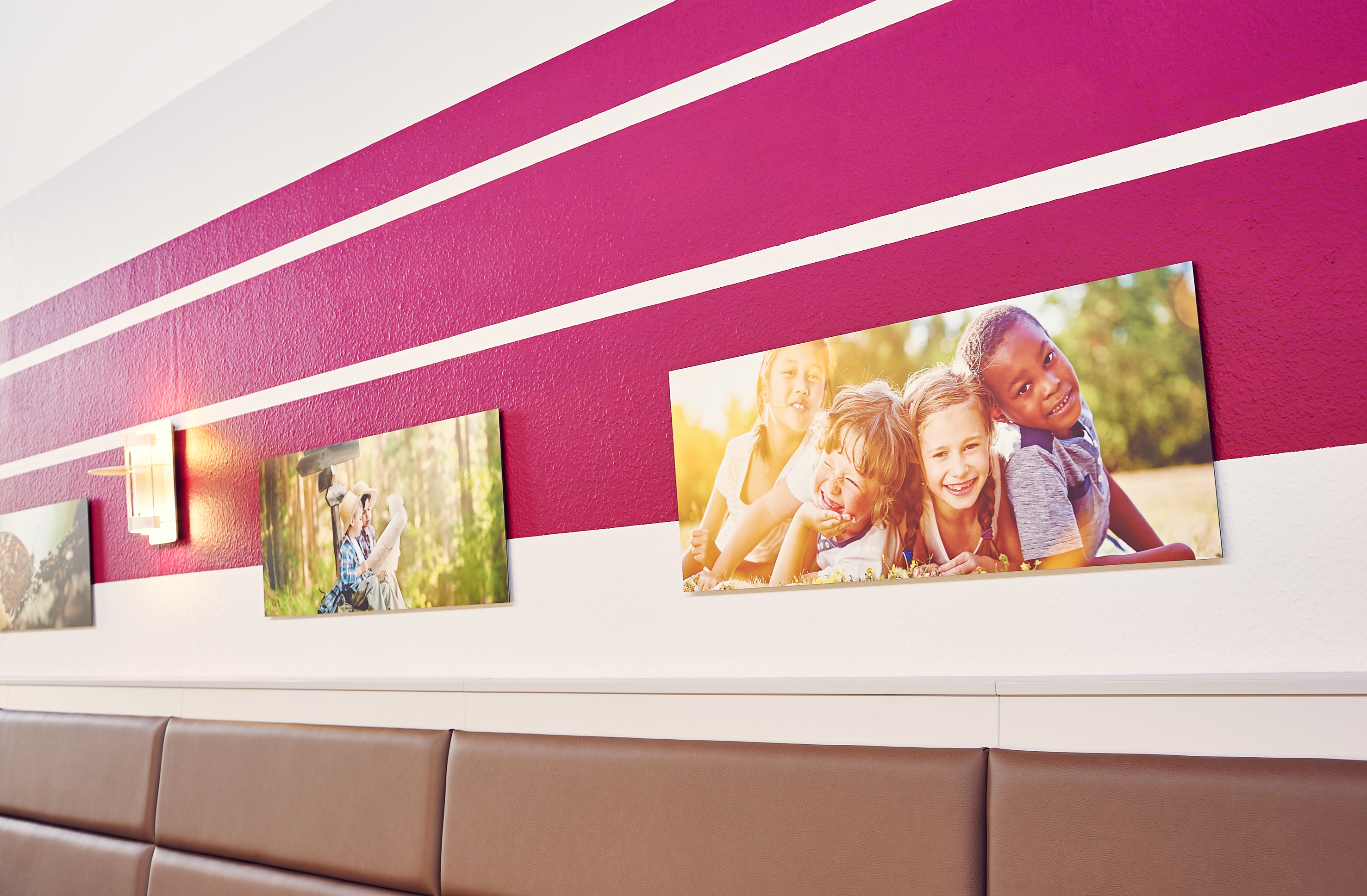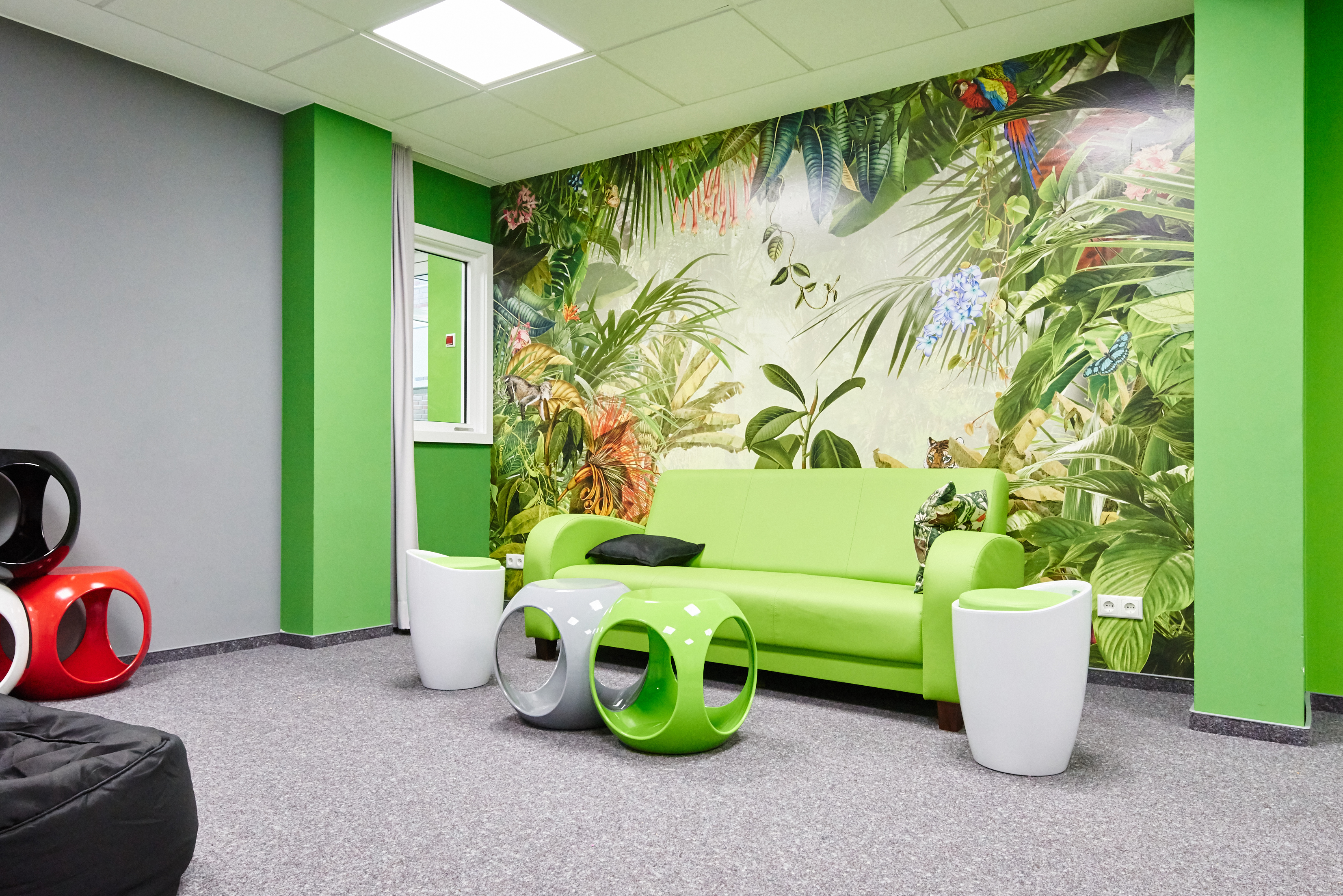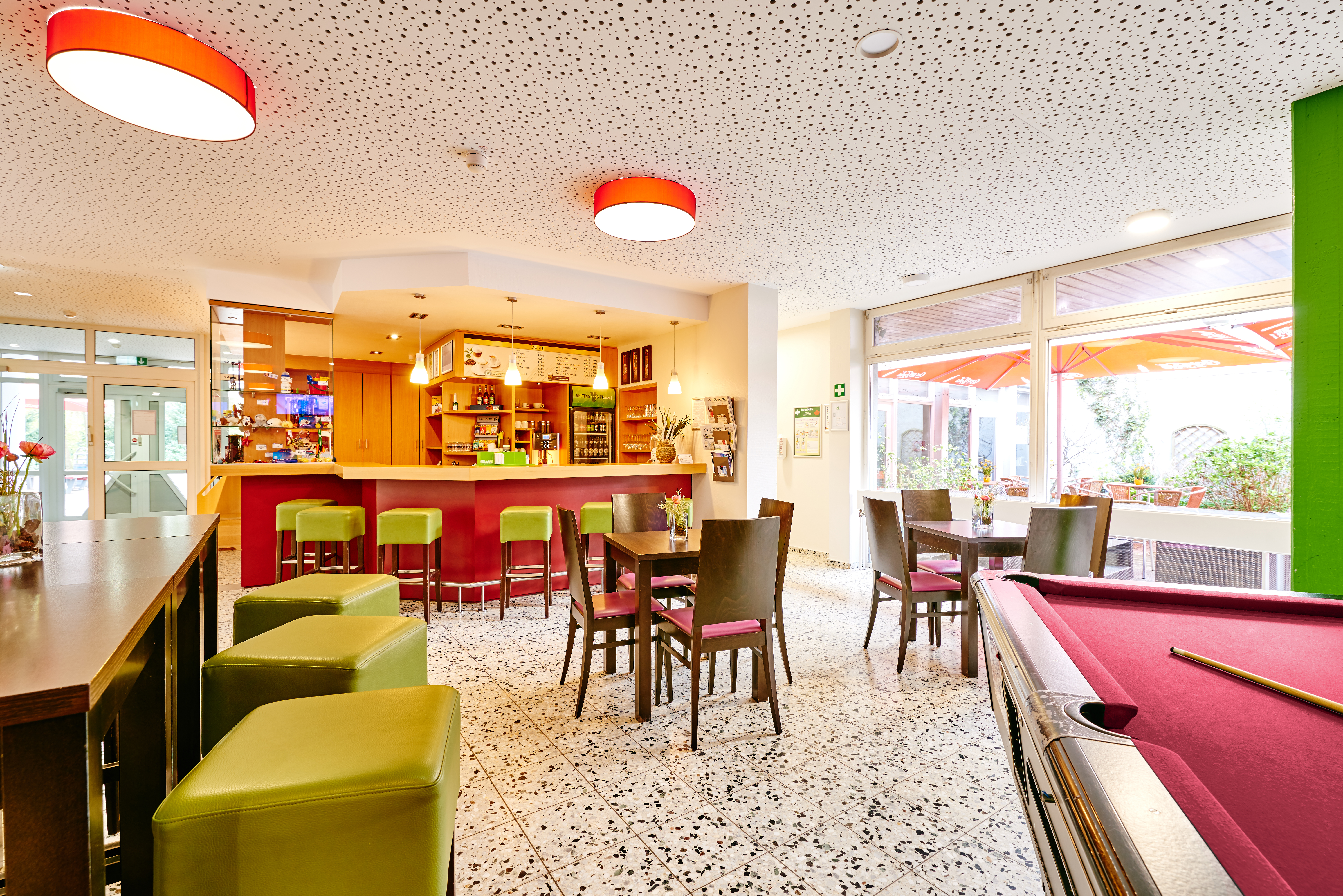 In der Jugendherberge Rotenburg selbst hat sie zu kräftigeren Farben gegriffen. Dort sind die Wände in tiefes Grün und Rot getaucht. Rot habe ich verwendet, weil die Farbe im Haus bereits eingesetzt wurde‘, erklärt die Innengestalterin. Und Grün funktioniert hier wunderbar als Komplementärfarbe.‘ Da sie beruhigend wirken soll, kommt die Farbe beispielsweise in der Lehrer-Lounge zum Einsatz, kombiniert mit warmen Rot- und Lilatönen. And der Wand: eine große Fototapete im Dschungel-Design. Florale Bilder sind dieses Jahr im Trend, das ist aber nicht der einzige Grund. Ich versuche immer, einen Bezug zur Natur herzustellen.‘ Die Rattan- und Holzmöbel aus dem Bestand passen dazu und kommen im neugestalteten Raum jetzt viel besser zur Geltung.