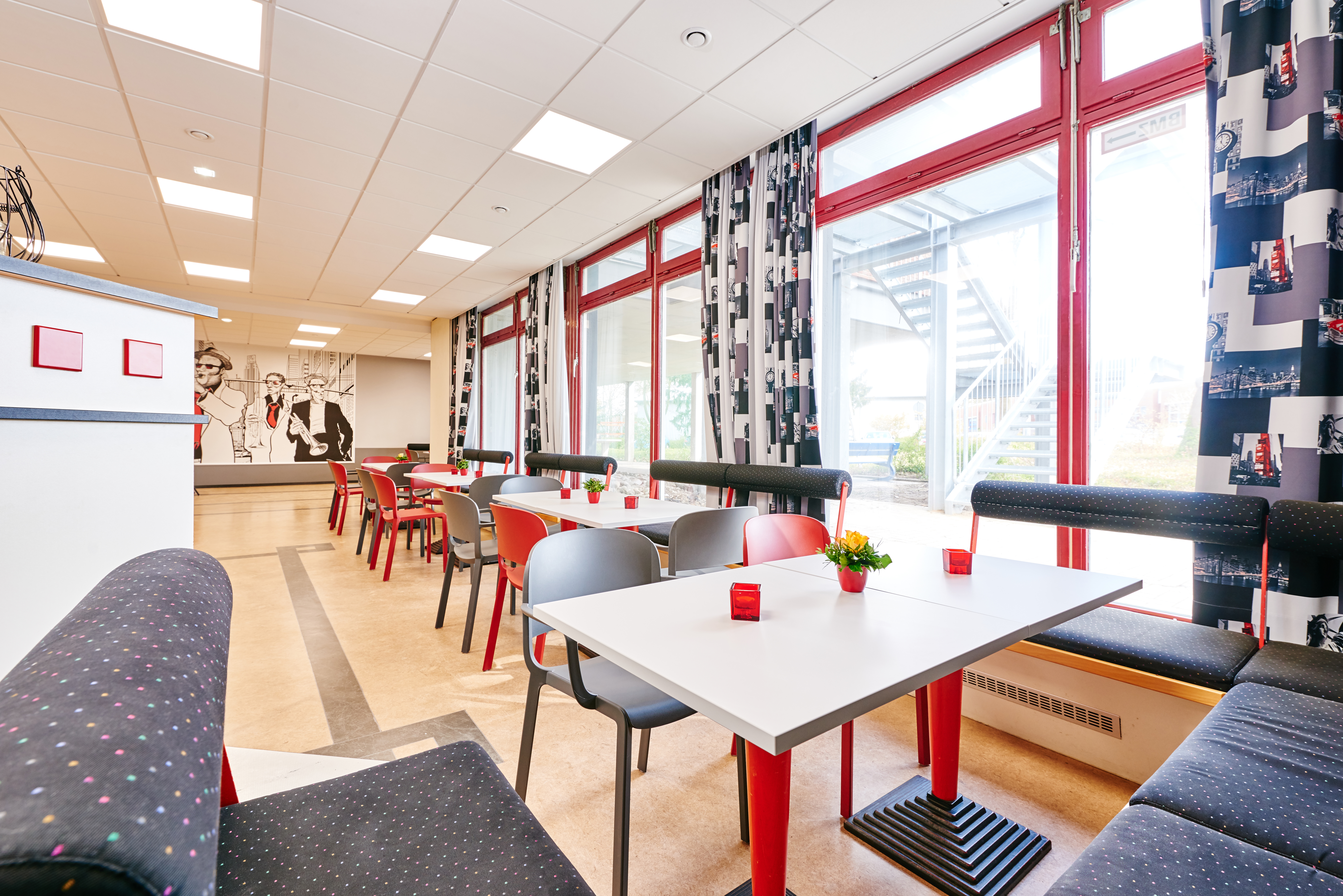 Die Jugendherberge Rotenburg zum Beispiel wird viel von Sportgruppen genutzt, deshalb hat Ilka Sportmotive an die Wand bringen lassen. Eine Designerin hat zudem Bekanntes aus dem Stadtbild gestaltet und in Grafiken in verschiedenen Rottönen verwandelt, die sich nun im Speisesaal und im Empfangsraum entdecken lassen. Die Disko hingegen sieht ein bisschen nach Big Apple aus: Die Vorhänge zieren Wolkenkratzer wie in New York, die Möbel sind urban rot und schwarz, und an der Wand hängt eine riesige Zeichnung von Musikern.