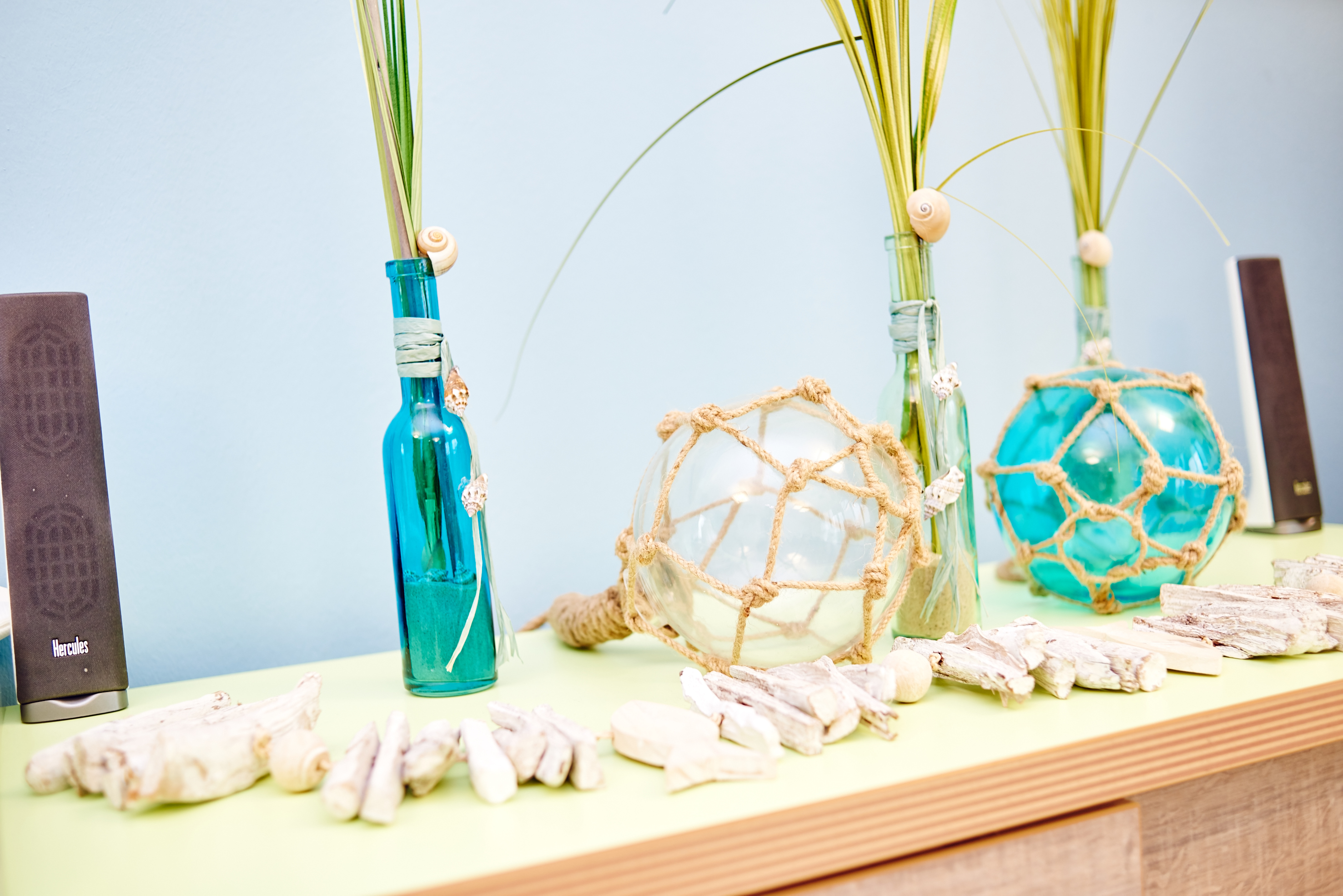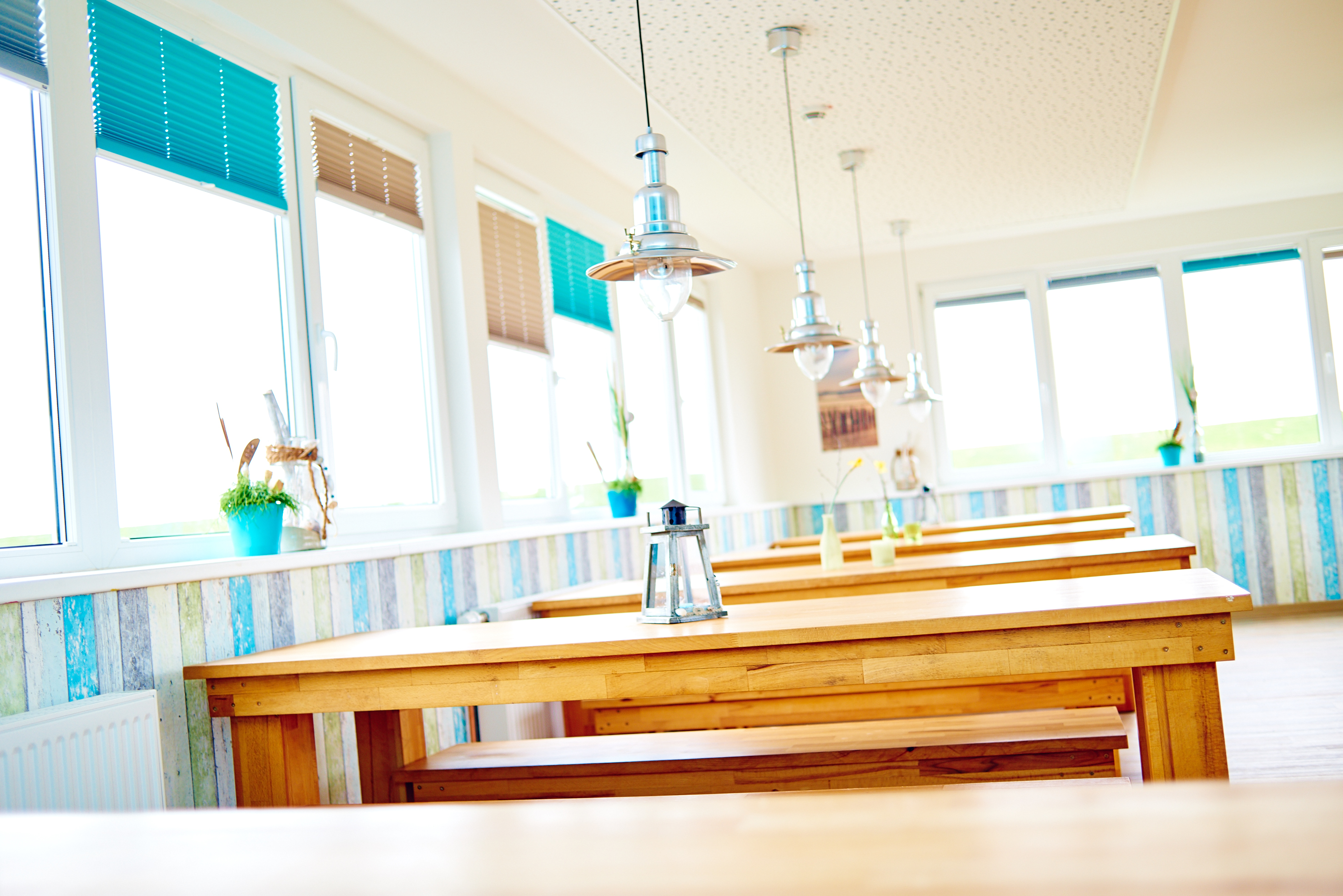Anders in der Jugendherberge Schillighörrn: Dort, direkt hinter dem Deich an der Nordsee, fühlt es sich bereits am Empfang an wie am Strand. Verschiedene Mint-Töne sorgen für Frische, große Bilder von Wasser, Sand und Strandgut hängen an den Wänden im neuen Speisesaal (den Ihr hier übrigens auch in unserem Video sehen könnt), und Dekoelemente unterstützen die helle Urlaubsatmosphäre. „Klar: Die Nordsee sieht nicht Mint oder Türkis aus. Aber diesen Frischekick, den man bekommt, wenn man am Strand spazieren geht, den vermittelt die Farbe. Und genau das sollen die Besucher der Jugendherberge Schillighörn spüren“, erklärt Ilka.