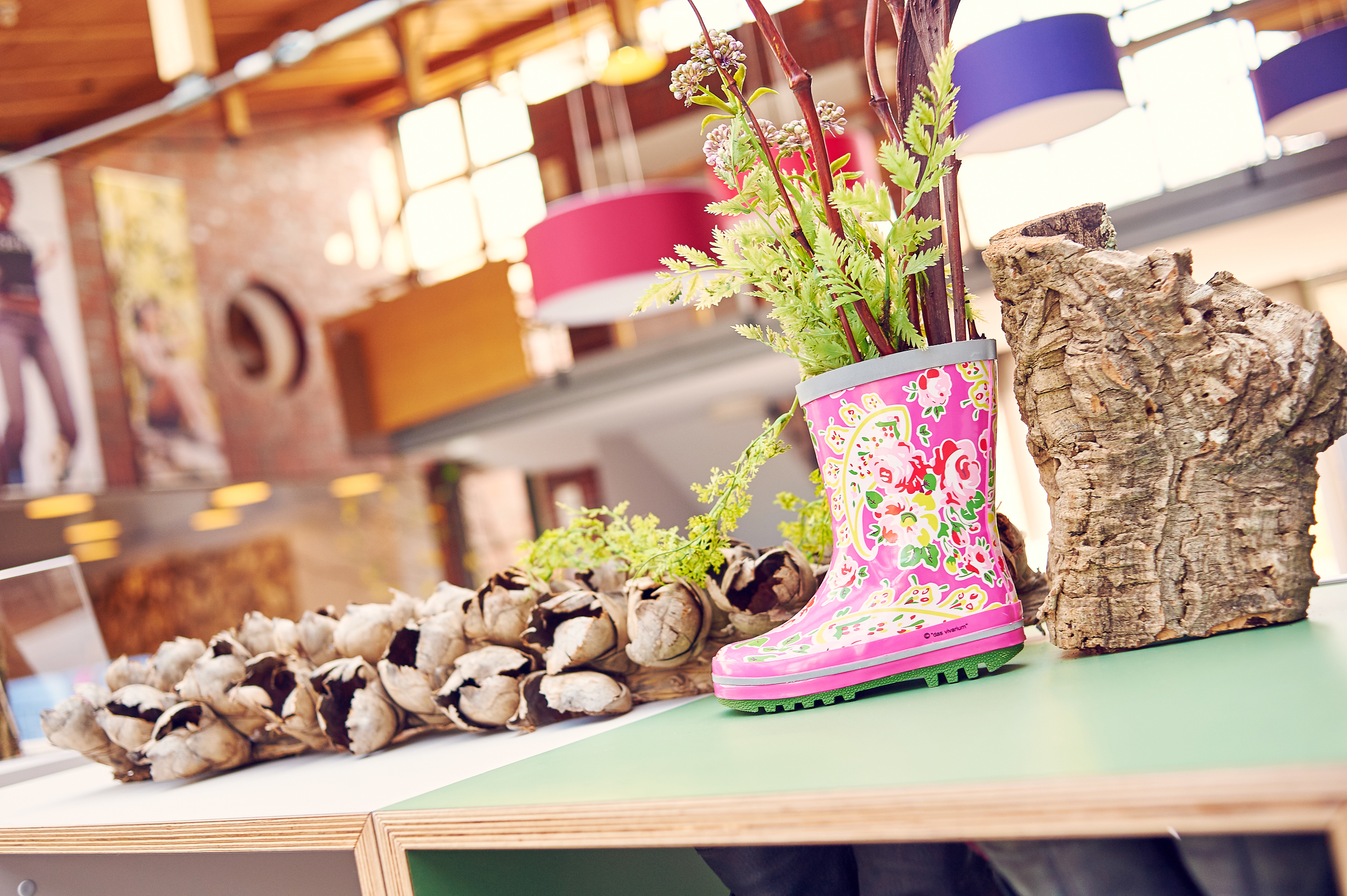 In der Jugendherberge Thülsfelder Talsperre, die mitten im Grünen liegt, spielt stattdessen der Wald eine wichtige Rolle: Ein weinrotes Sofa steht vor einer Fototapete, auf der Holzstämme abgebildet sind. Der große Speiseraum, der einst altbacken und langweilig aussah, erstrahlt jetzt in warmen Farben, die perfekt zu den Möbeln passen. Am Eingang, an dem man seine Schuhe lässt und zu Puschen wechselt, stehen bepflanzte Gummistiefel. Auch das macht Ilkas kreative Ader aus. Dann kommt sie mit einer großen Tüte voller Grün in den Raum, breitet sich auf dem Fußboden aus und fängt an zu schnibbeln, zu kombinieren und zusammenzustecken, bis daraus etwas völlig Neues entsteht.