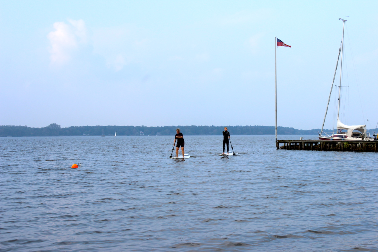 Was augenscheinlich schnell gelernt werden kann, ist das Stand Up-Paddling. Als ich im letzten Jahr – wie oben schon erwähnt – vor Ort war, konnte ich beobachten, wie sich eine Frau spontan entschied, den Holzsteg am Bad Zwischenahner Meer gegen ein SUP-Brett zu tauschen. Einen Neopren-Anzug konnte sie sich ausleihen – und eh ich mich versah, war sie auch schon viele Meter entfernt auf dem Wasser und schwang das große Paddel regelmäßig durch den Wellen. Reingefallen ist sie nicht einmal. Auch das ist eine unkomplizierte Variante, im Sommer auf dem Wasser unterwegs zu sein.