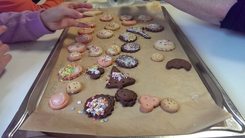 Na, da war doch gerade ein kleines Fingerchen in der Rührschüssel, oder? Wer das kleine Schleckermäulchen war, das ein bisschen Teig stibitzt hat, wissen wir nicht – alle Kinder schauen ganz unschuldig, während sie mit Eifer aus dem Teig vor ihnen auf dem Tisch runde Formen ausstechen.