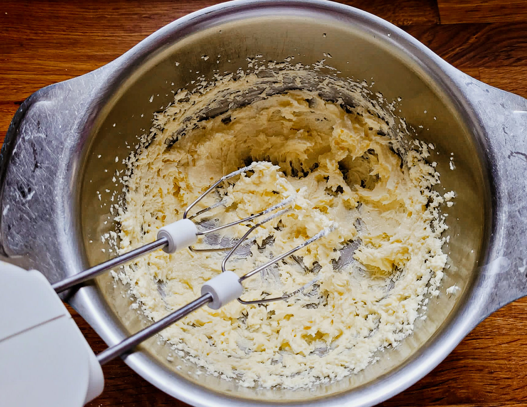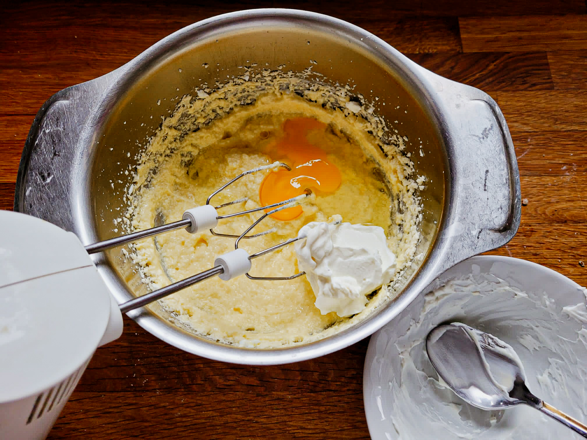 Weiche Butter oder Margarine mit dem Zucker und Vanillezucker mit einem Rührgerät schaumig rühren. Nacheinander die Eier dazu geben und weiter rühren.