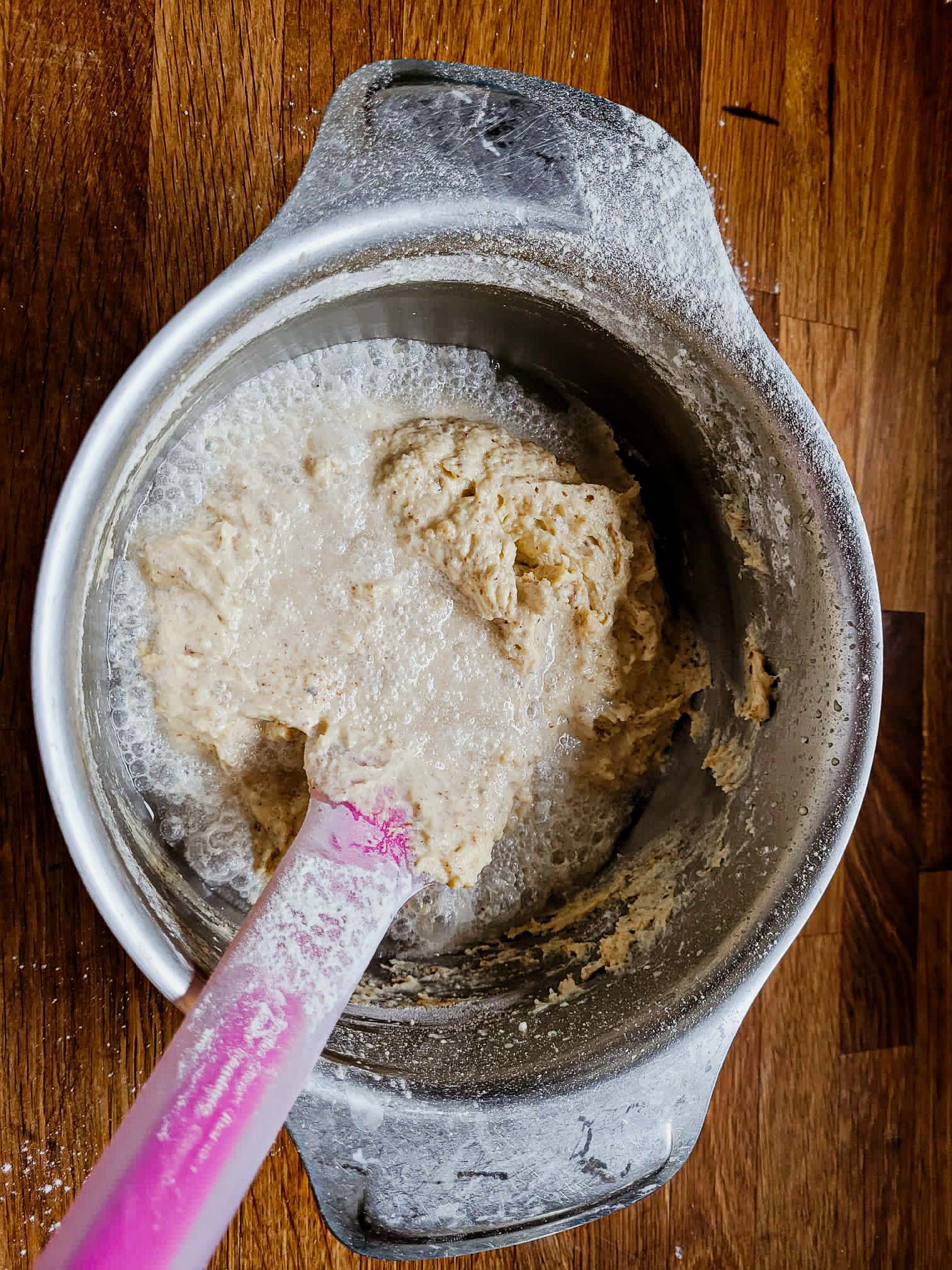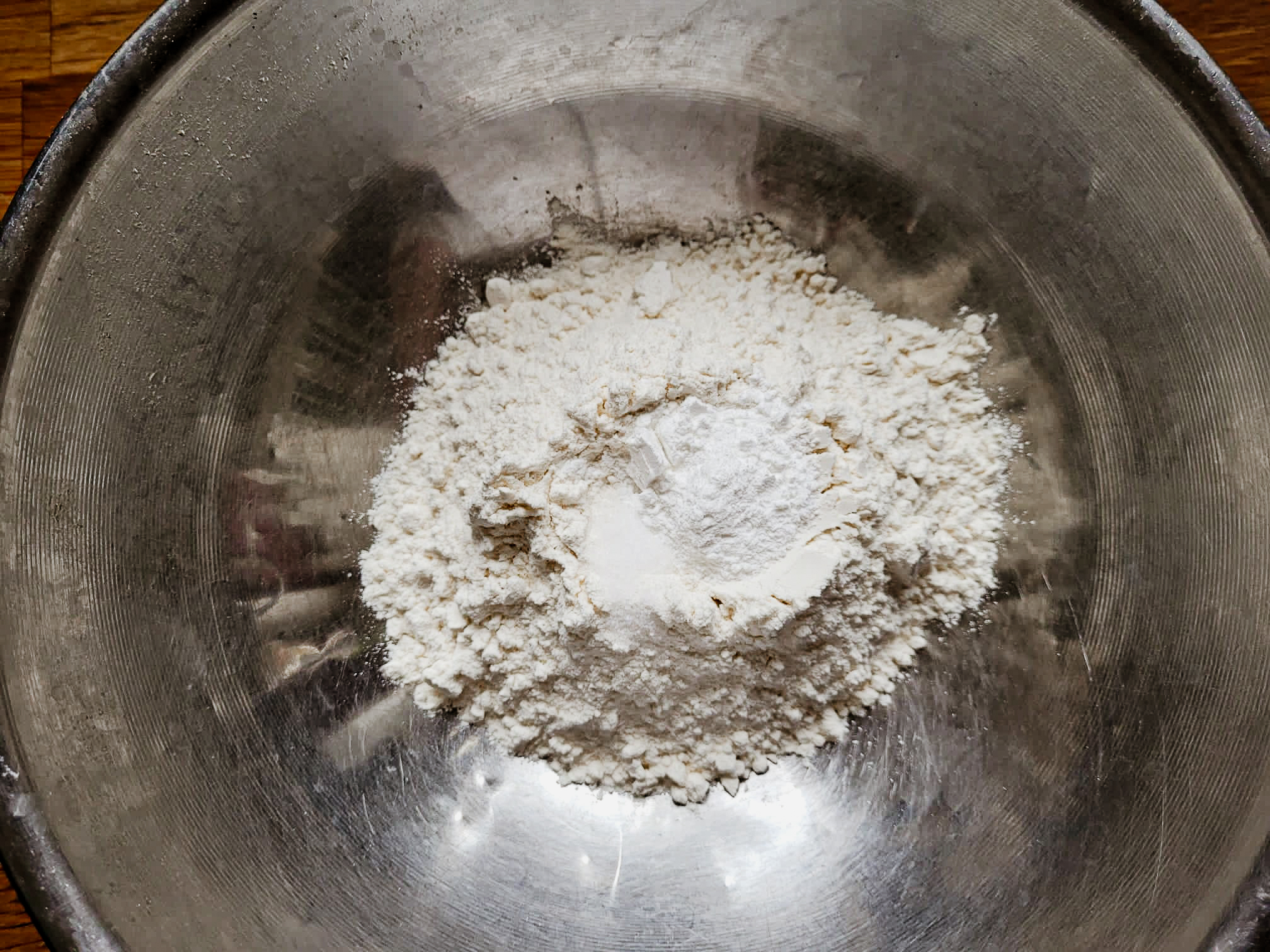 Quark unterheben. Das Backpulver mit der Prise Salz unter das Mehl mischen. Durch ein Sieb zur Quarkmasse geben. Mandelgrieß ebenfalls dazu geben und unter das Ganze unterheben. Mit Hilfe des Mineralwassers zu einer geschmeidigen Masse verrühren. Für ca. 10-15min ruhen lassen, dann wirkt das Backpulver besser.