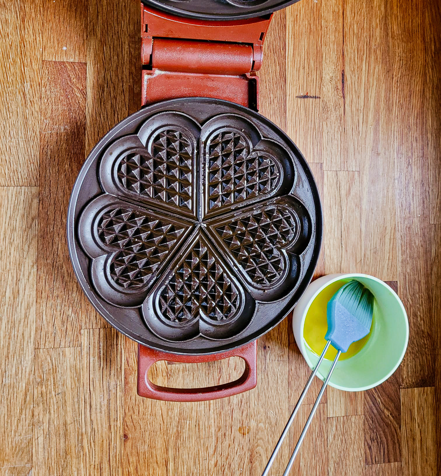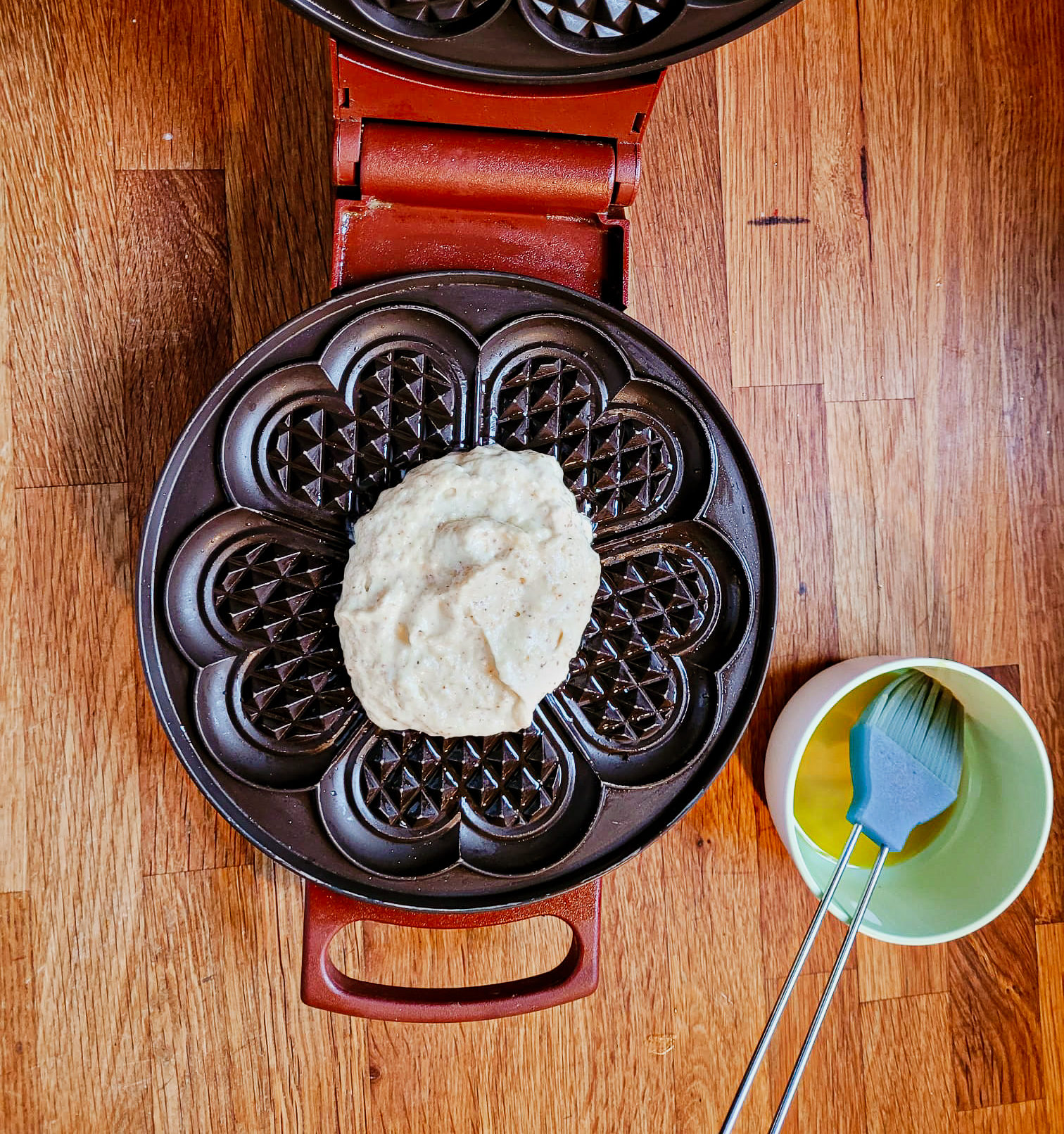 Das vorgeheizte Waffeleisen einfetten, einen Klecks Teig in die Mitte geben und langsam zu manchen, so das die Masse sich gleichmäßig verteilt.