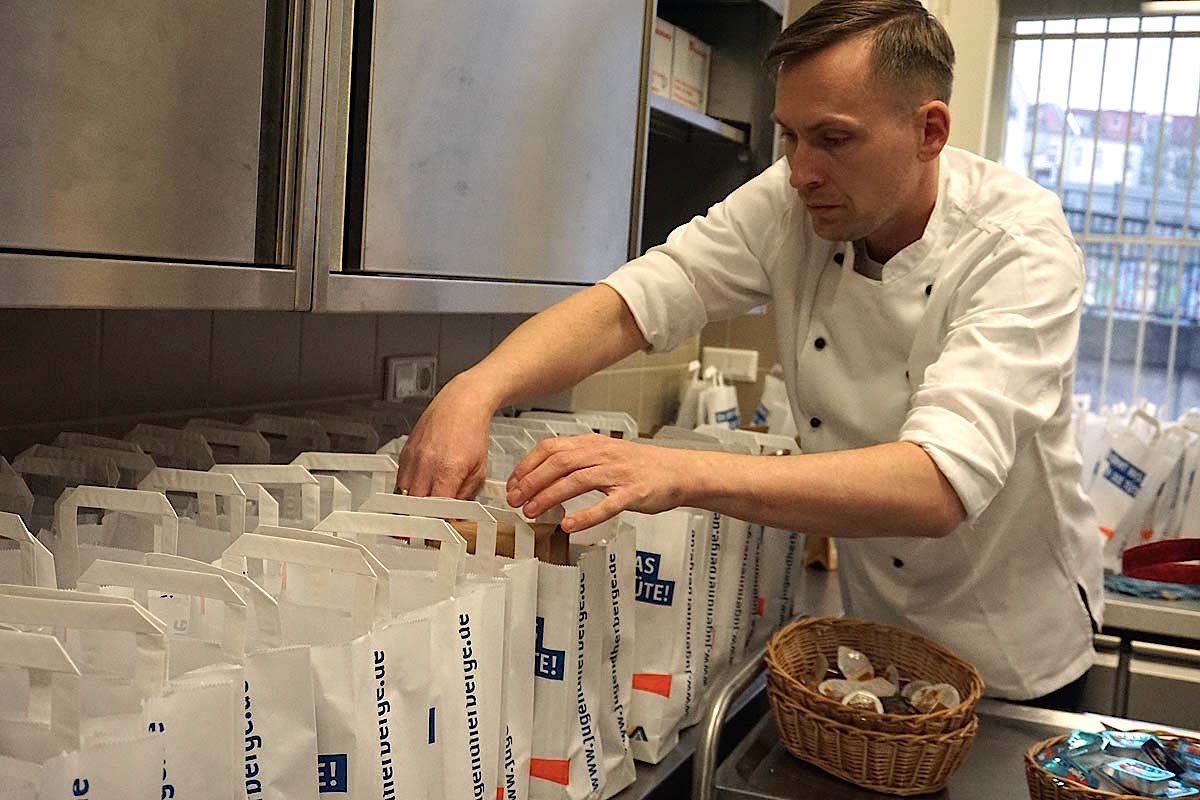 Die rettenden Küchen-Engel sind allerdings in der Überzahl und wir fanden sie in der Jugendherberge Berlin-Ostkreuz. Mit ihnen wurden wir uns schnell und konstruktiv einig. Und als wir am Mittwochmorgen bei Herrn Wetzel und seinem Team ankamen, waren alle schon eifrig dabei, die 30 vegetarischen und 30 nicht-vegetarischen Varianten der Baguettes mit viel Fingerspitzengefühl zu belegen, sie in die von uns gesiebdruckten Luchbags zu stecken und diese wiederum mit Obst, Wasser & Co. in die traditionellen Papiertüten der Jugendherbergen zu verstauen. „Sollen wir Euch helfen?“ „Nee, braucht ihr nicht.“