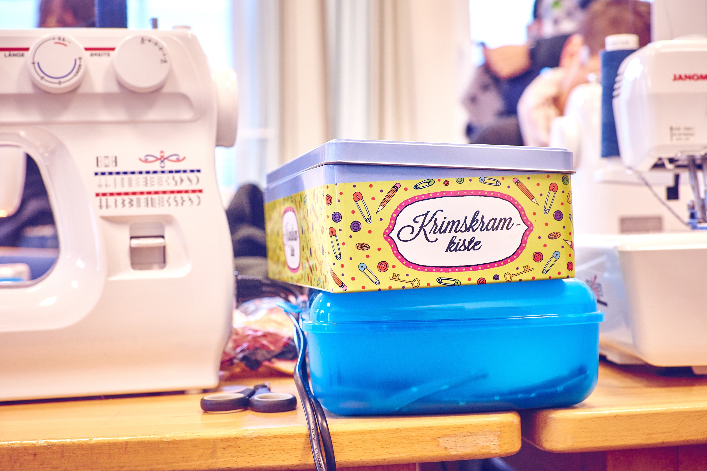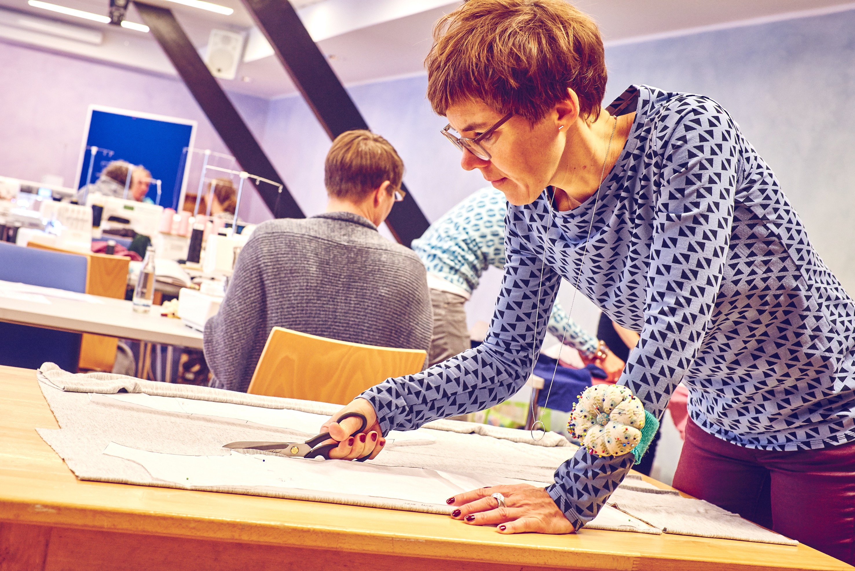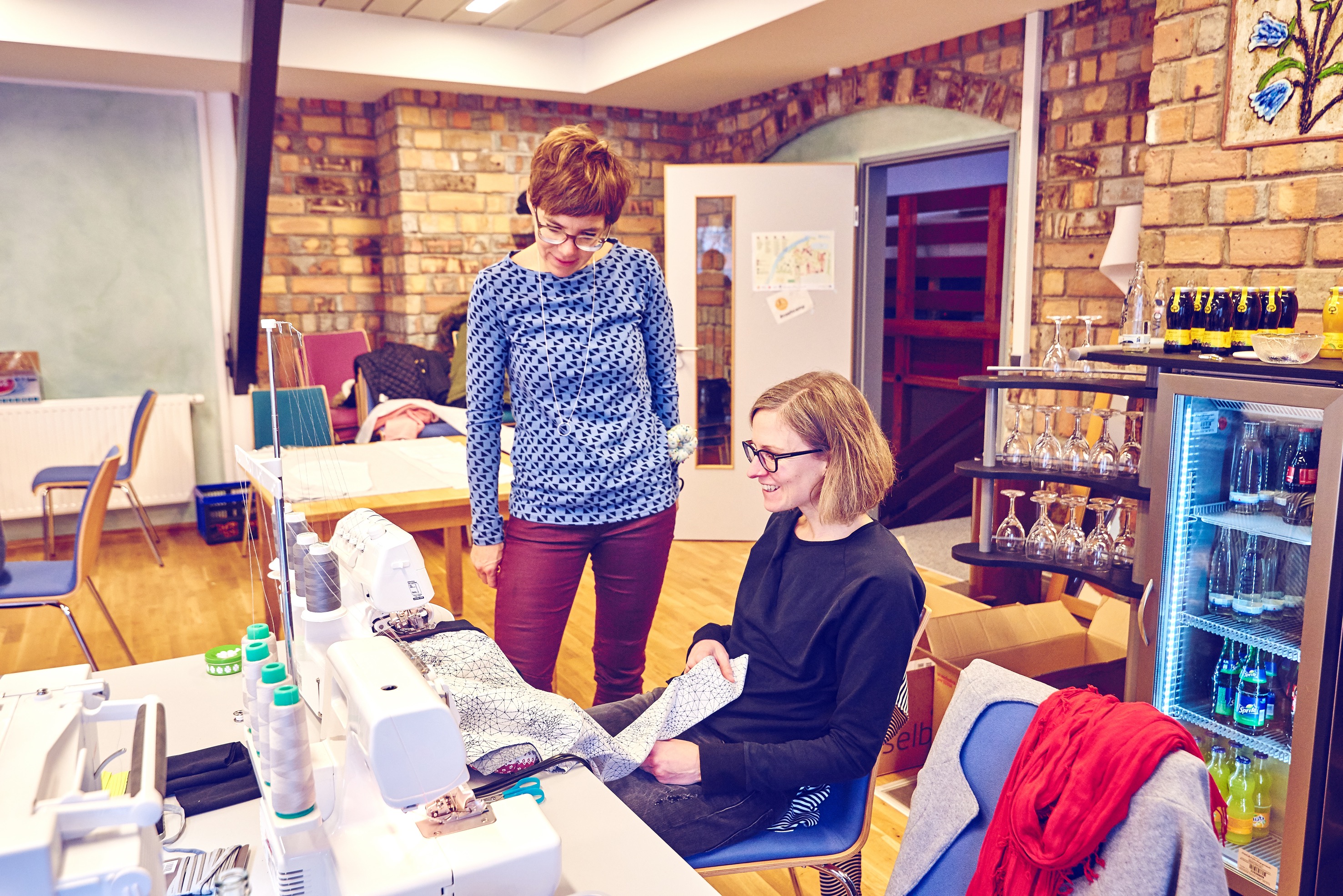 Überhaupt: Beim Nähcamp geht es total herzlich zu. Da wird beraten, anprobiert, gelobt und geholfen. Sandra aus Rastede zum Beispiel braucht einen Tipp, welcher Stoff zu dem Wal-Print des Shirts passt, das sie für ihr Kind nähen will. Sie kramt in ihrer Kiste, holt verschiedene Farben heraus. „Was meint ihr?“, fragt sie, und schnell sind sich alle einig: blau soll es werden. Sandra näht seit 16 Jahren, meist für sich allein im Dachgeschoss, das ihr Mann (der nach diesem Wochenende übrigens auch einen neuen Pullover bekommt) extra zum Nähzimmer ausgebaut hat. „Aber in dieser tollen Gemeinschaft zu nähen, das macht einfach noch viel mehr Spaß“, freut sich die 49-Jährige.