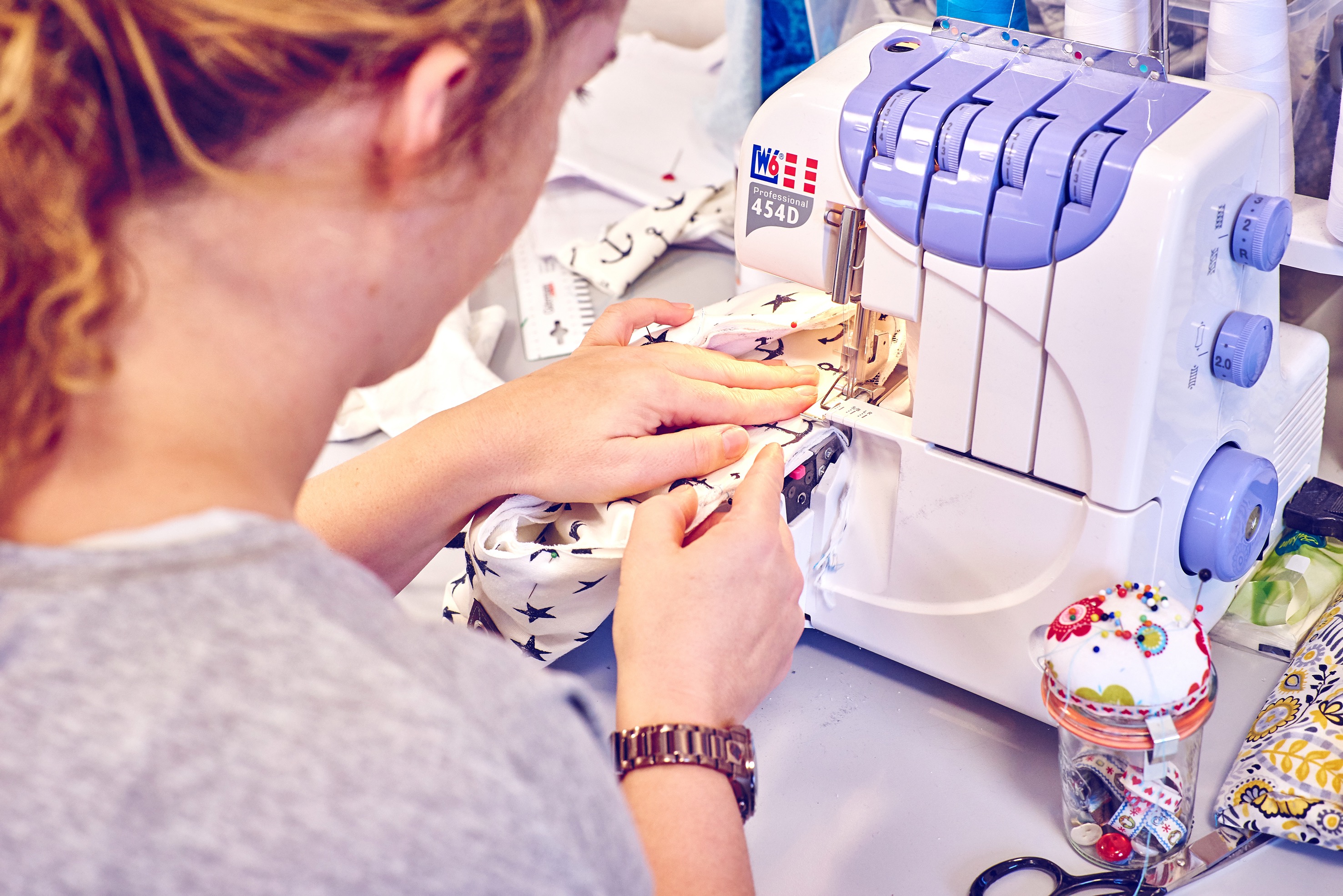 Trrrrrrrr-trrr-trrrrrrr. Die Nadel der Nähmaschine rattert über den Stoff, hämmert den Faden zwischen das Gewebe. Das Gerät surrt leise, ein tiefes, sanftes Surren, jedes Mal, wenn Goldlocken-Gina ihren Fuß auf das Pedal unter dem Tisch legt. Die 44-Jährige, die ihren Blogger-Namen nach ihrer prachtvollen Frisur gewählt hat, hat den Kopf gesenkt, den Blick durch die Brille angestrengt auf das Stück Stoff gerichtet, das sie mit den Händen gleichmäßig Stück für Stück unter der Nadel durchschiebt. Normalerweise, in ihrem Hauptberuf, ist die gelernte Goldschmiedin eher metallische Hintergrundgeräusche gewöhnt. Oder klare Töne, wenn sie mit einem der zwei Chöre unterwegs ist, in denen sie singt. Jetzt aber, beim Nähcamp im DJH-Resort in Neuharlingersiel, ist das Geräusch der Nähmaschine ihr Soundtrack des Wochenendes.