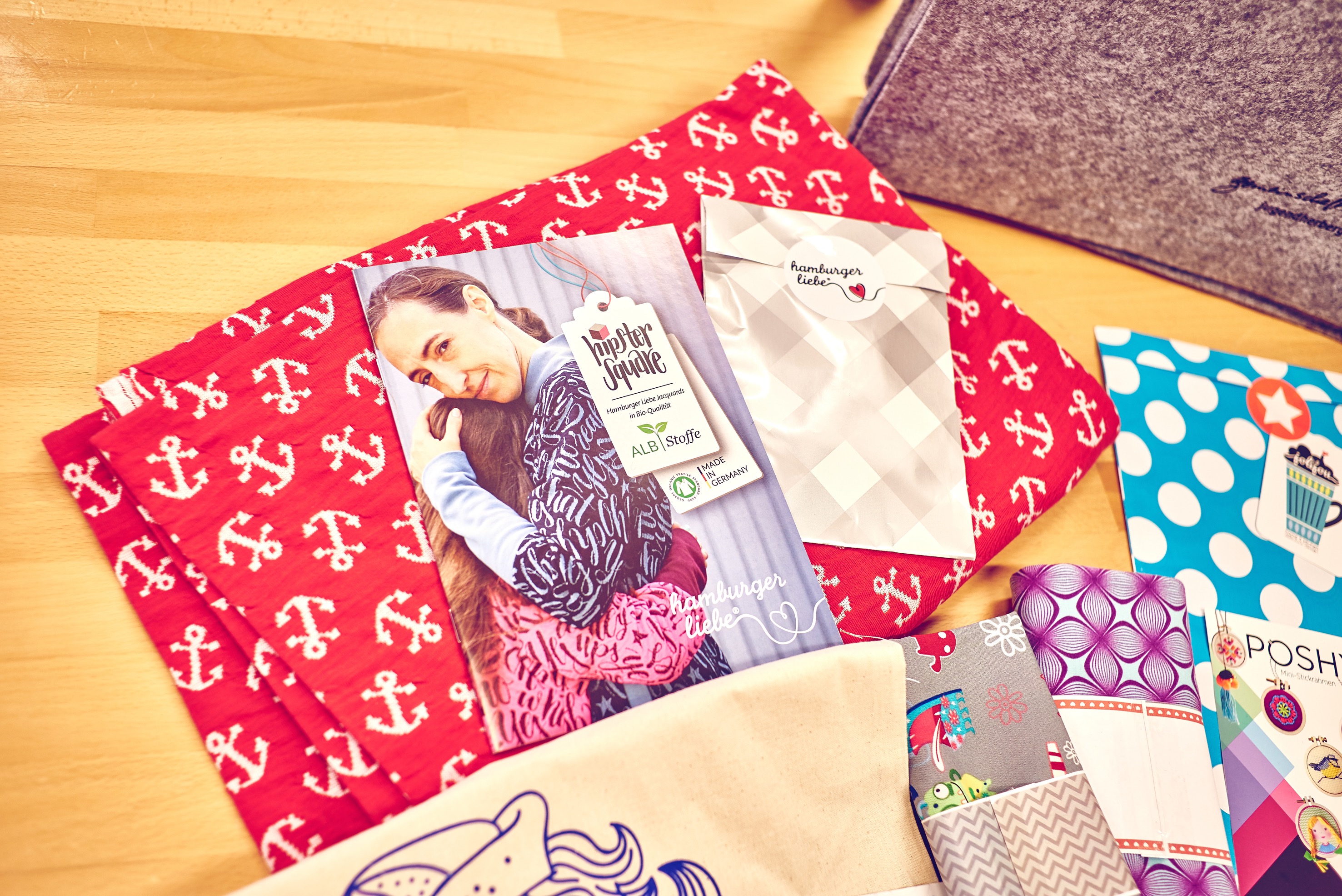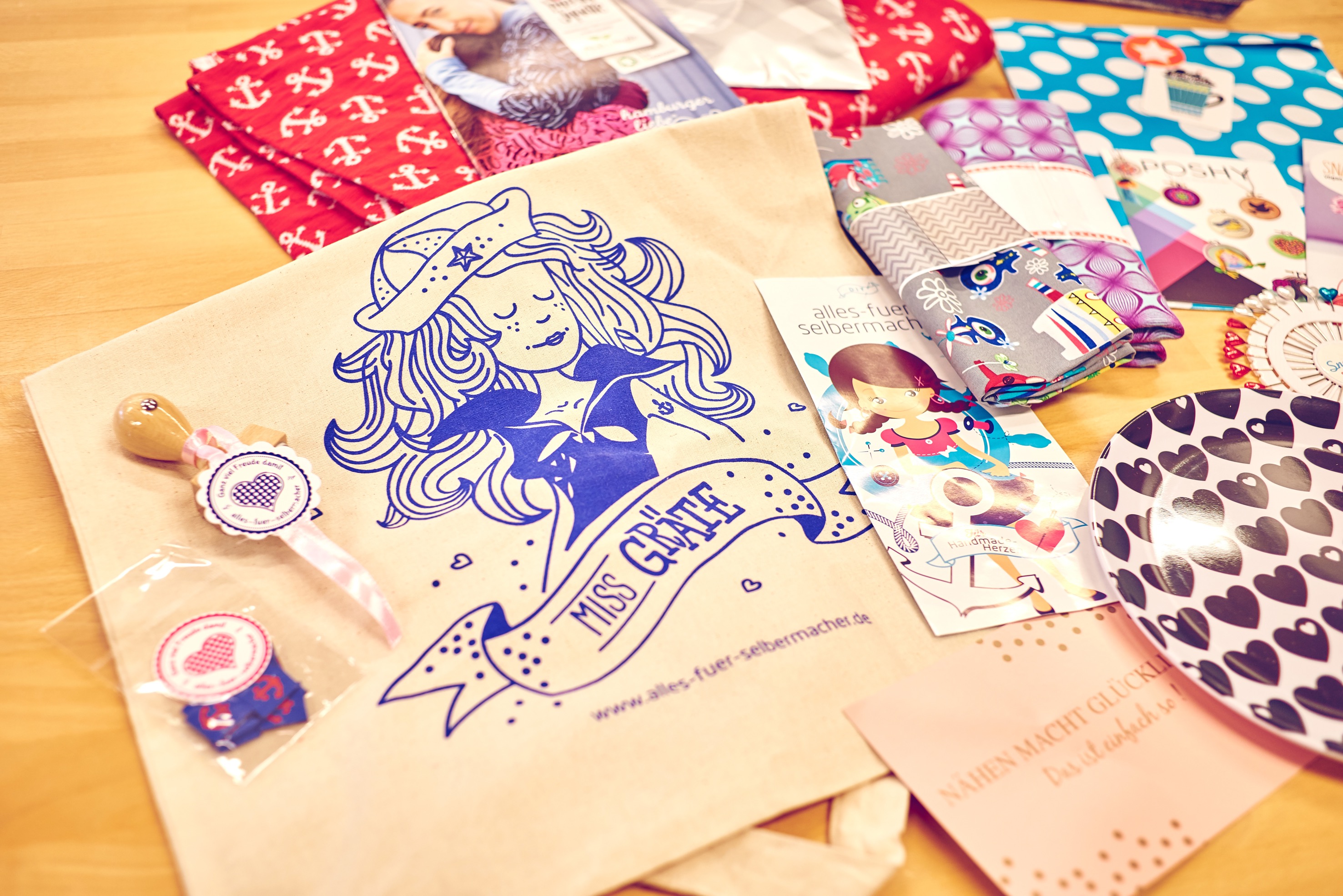 Natürlich schafft sie noch etwas: unter anderem den Mantel „Frau Ava“. Dieser ist eindeutig das beliebteste Stück an diesem Wochenende. In grün, blau, schwarz, in allen möglichen Farben wird er zugeschnitten, und die Hobby-Näherinnen inspirieren sich gegenseitig mit ihrer Arbeit, tauschen sich über das Innenfutter aus, helfen sich beim Knöpfe annähen. Manche sind gleich mit zwei drei Nähmaschinen angereist, sodass sich selbst der ein oder andere Ausfall kompensieren lässt. Bei Ankunft gab es übrigens noch etwas ganz Besonderes dazu: Ein Goodiebag voller Überraschungen – mit Produkten von ALBStoffe, alles-fuer-selbermacher.de, hamburger liebe, byGraziela, Glücksmarie, Snaply Nähkram und jolijou.