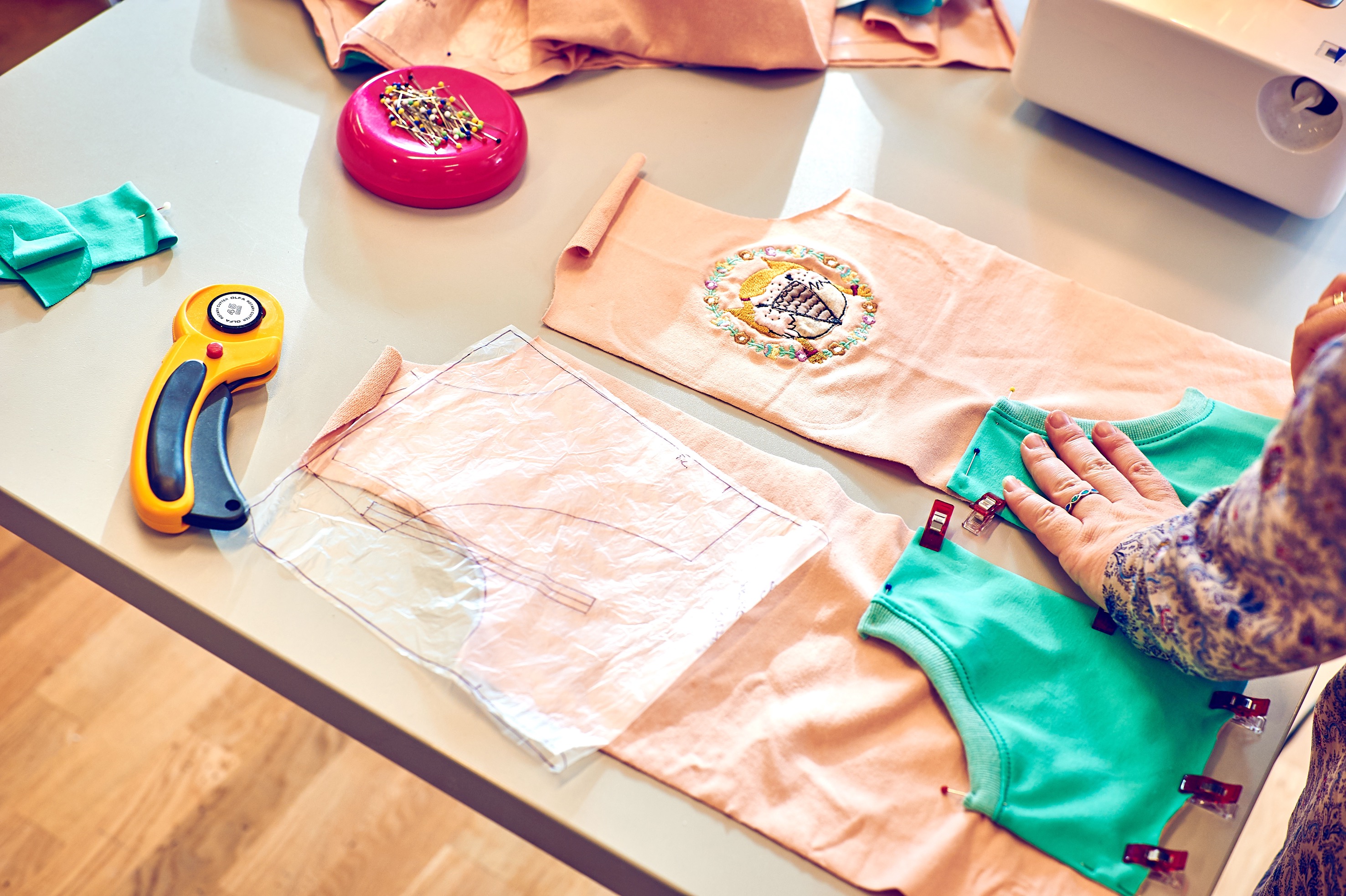 Eine von ihnen ist Christiane. Seit drei Jahren ist sie dabei, 2012 hat sie bereits angefangen zu nähen. „Ich habe Hedinaeht immer verfolgt, weil mich die einfachen, schnellen Schnitte fasziniert haben“, sagt die 32-Jährige, die selbst auch unter dem Namen Ranelabel bloggt. Mit kleinen Täschchen hat sie begonnen – nun näht sie ganze Outfits für sich und ihre Tochter. Das Kleid, dass sie trägt, ist eines dieser selbst gemachten Stücke. „Ich mag es, selbst zu entscheiden, welches Muster der Stoff haben soll, aus welchem Material das Teil ist“, sagt sie. Vor allem aber hat das Nähen für sie eine entspannende Wirkung. „Auf der Arbeit werde ich quasi nie fertig, da habe ich am Ende nichts in der Hand. Beim Nähen sehe ich direkt ein Ergebnis – das ist schön.“