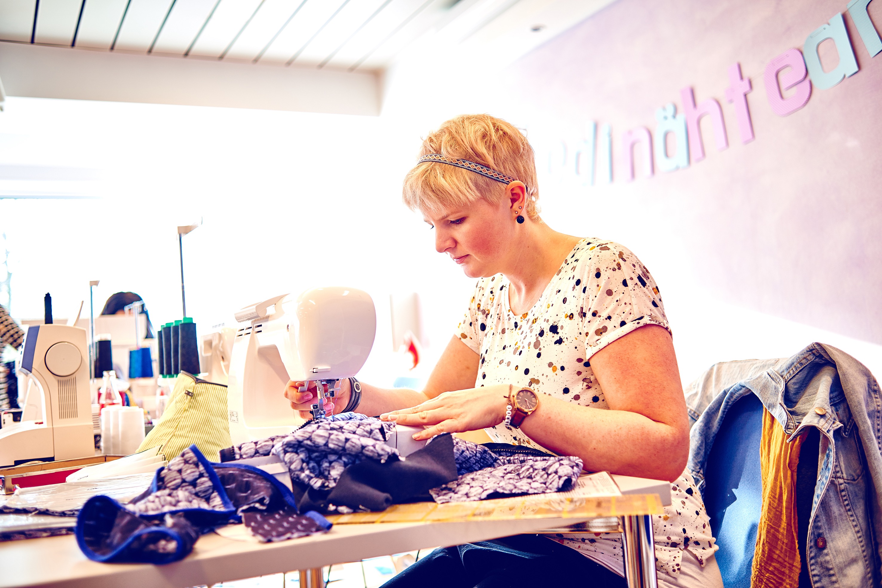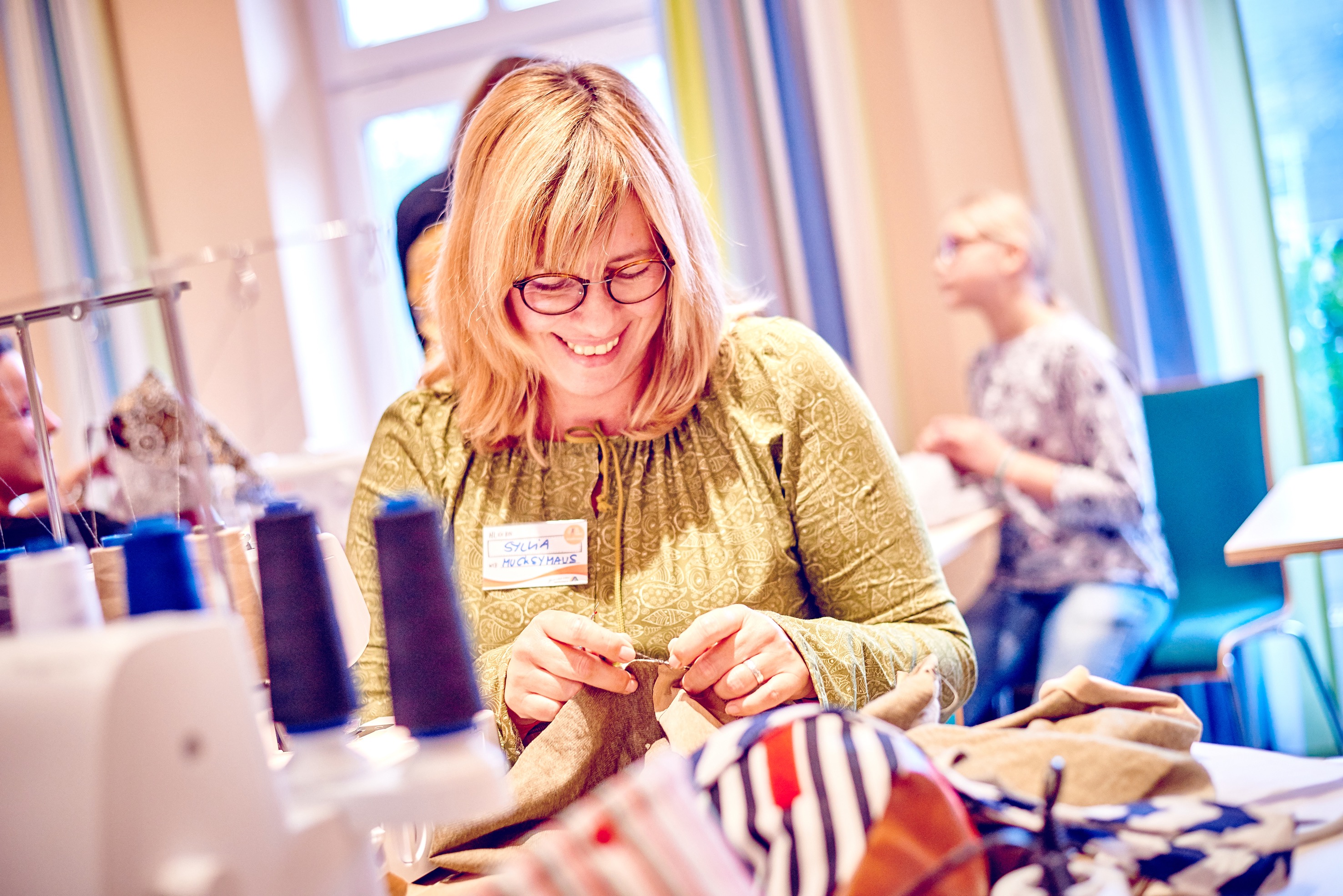 Auch für Goldlocken-Gina steht der Spaß im Vordergrund. Material für mindestens drei Kleidungsstücke hat sie sich mitgenommen. „Aber ich seh das ganz entspannt“, sagt die 44-Jährige aus Duisburg lachend. „Ich freue mich, einfach mal die ganzen Leute kennen zu lernen, denen ich in den sozialen Medien so folge.“ Schon am Anreisetag haben sie gemütlich in kleiner Gruppe bis weit nach Mitternacht genäht; manche der Frauen sind an diesem Samstag dann sogar extra früh aufgestanden, um direkt weitermachen zu können. „Für mich ist es aber auch ok, wenn ich am Ende gar nichts fertig bekomme“, sagt Gina.
