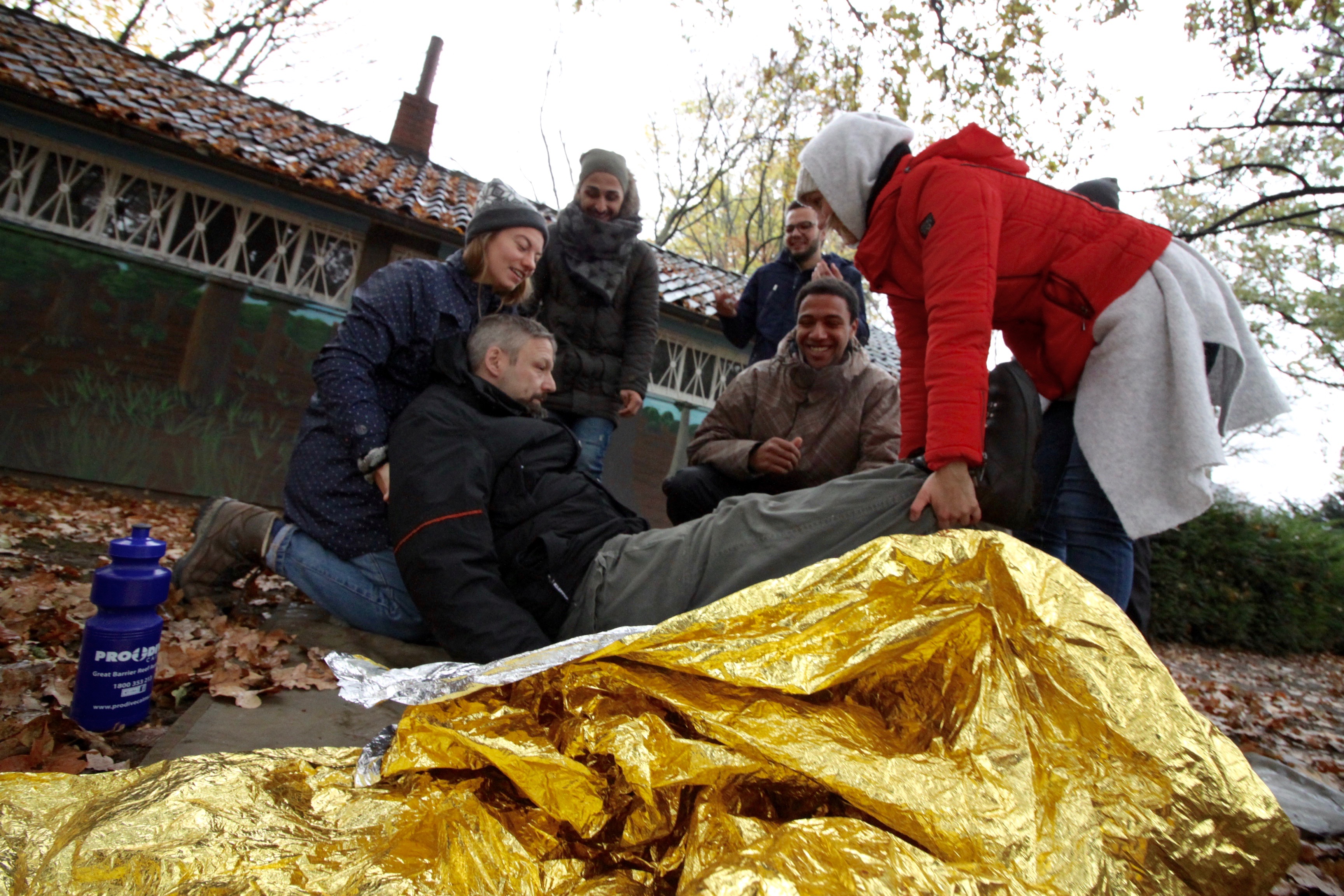 Aber: Manchmal sind es auch die kleinen Dinge, die in Vergessenheit geraten. Zum Beispiel, mit welcher Seite nach oben die Rettungsdecke aufgelegt werden sollte. „Am besten mit der goldenen Seite nach außen“, erklärt Frank Draeger, ausgebildeter Rettungssanitäter sowie Gründer der Survival- und Wildnisschule, und hat auch gleich eine Eselsbrücke dafür parat. „Denkt immer daran, dass ihr die Person ‚vergolden‘ wollt.“ Eine andere Merkhilfe für eine Frage, die an diesem Tag immer wieder aufkommt: Beine hoch oder nicht? „Beine immer hoch, außer bei Schmerzen in den B’s: Birne, Brust, Bauch, Beine.“ Frank grinst. „Also quasi immer.“
