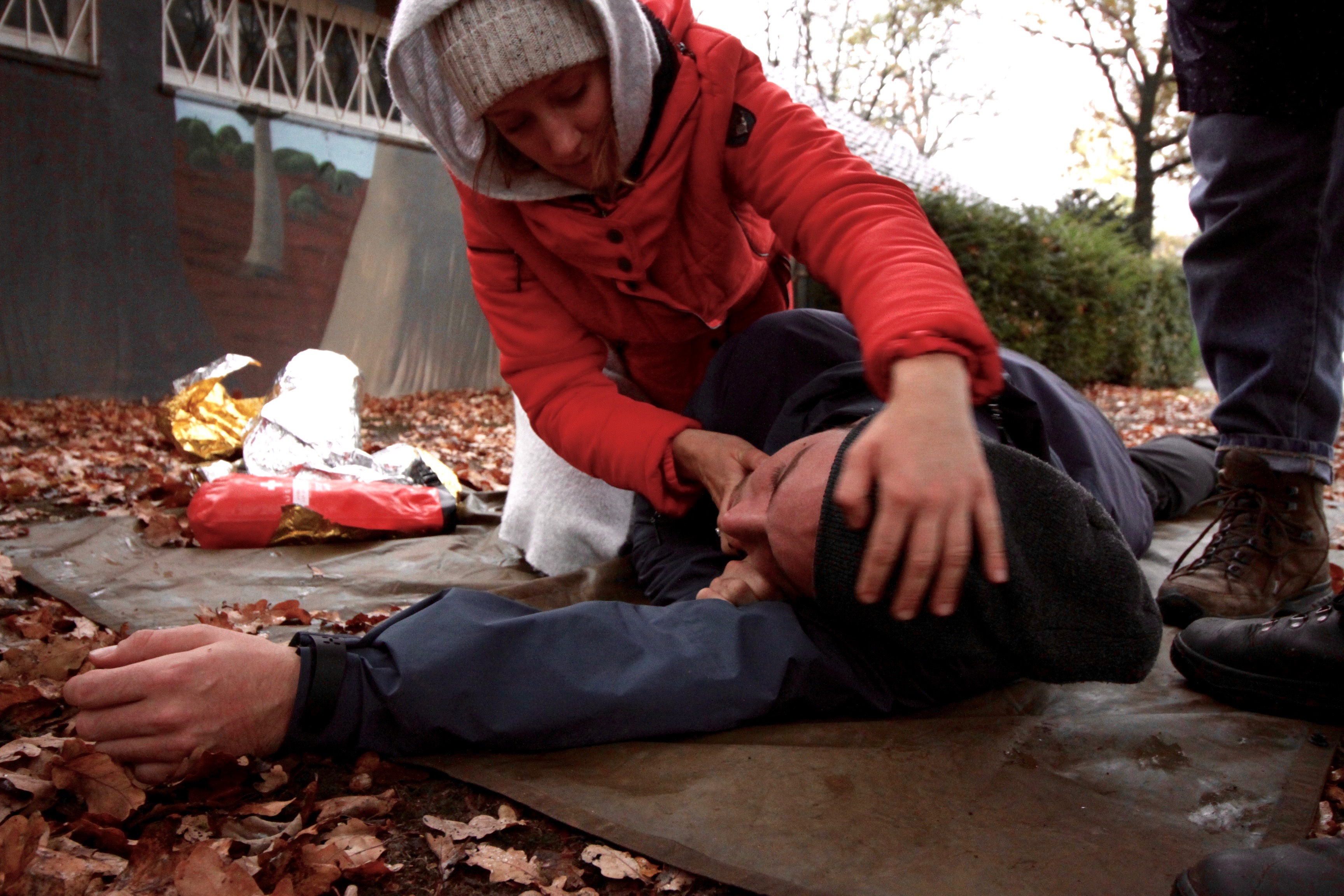 Schock in den Gesichtern der Teamer, die um ihn herum stehen. Eigentlich sollte es heute darum gehen, wie sie in einem Ernstfall reagieren können – beispielsweise auf den vielen Freizeiten für Kinder und Familien in den Jugendherbergen, die sie betreuen. Zwar müssen alle selbstverständlich einen Erste-Hilfe-Kurs absolvieren, bevor sie als Teamer eingesetzt werden – der Outdoor-Kurs soll diese Kenntnisse nur noch einmal vertiefen und sie dafür bereit machen, auch in Extremsituationen in unbekannter Umgebung schnell und richtig zu handeln.