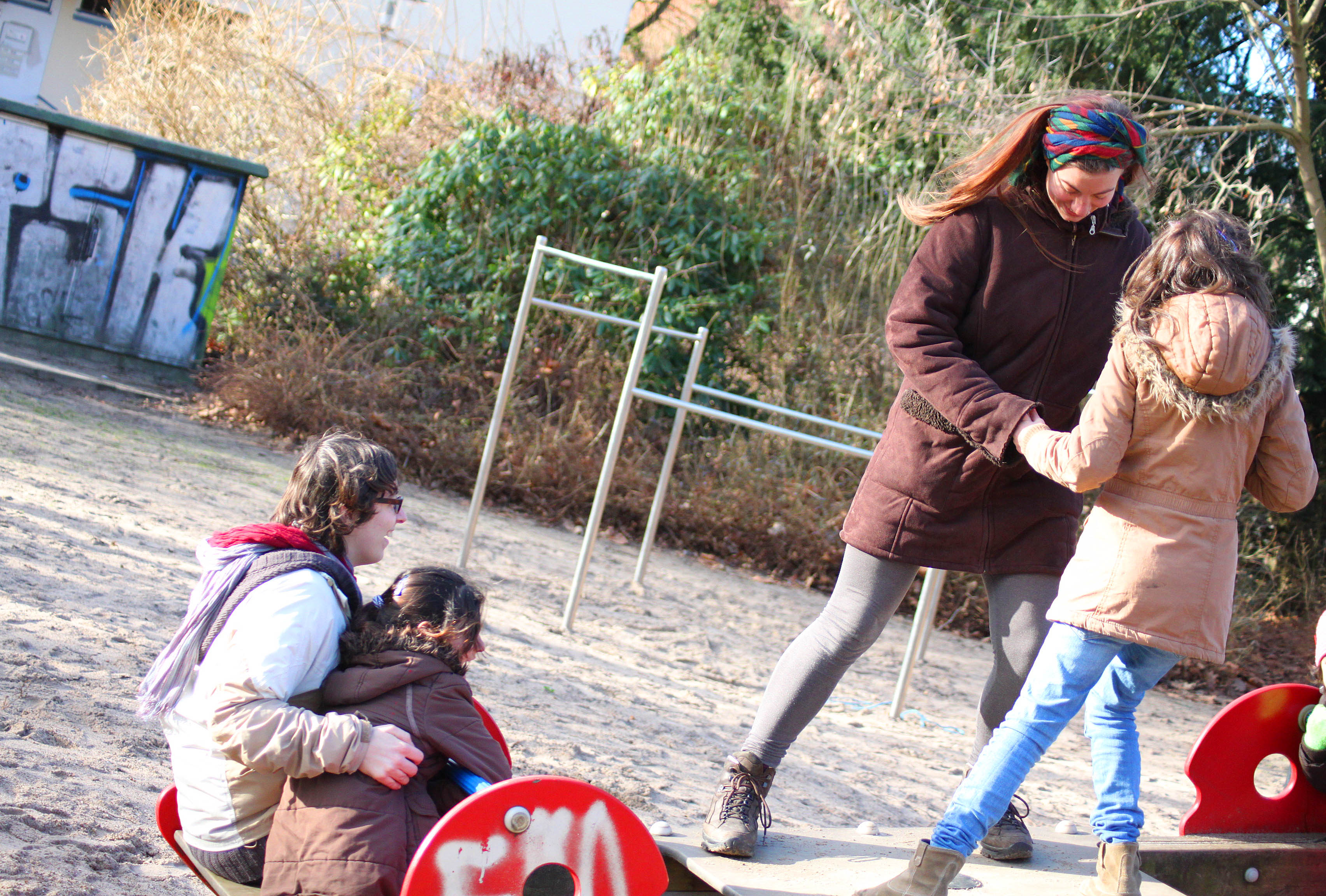 Amelie, Sina und Lena jedenfalls bereuen es nicht, dass sie den Schritt gewagt haben. Man kann kreativ arbeiten und frei überlegen, das mag ich‘, sagt die 22-jährige Sina, die Gesundheits- und Erziehungswissenschaften studiert. Und: ‚Man darf auch selbst nochmal Kind sein.‘ Dann geht sie rüber zu Amelie und Lena, die in der Mitte einer großen Wippe stehen, sich an den Händen halten und das Spielgerät mit ihren Füßen zum Schaukeln bringen. Die Flüchtlingskinder – auf jeder Seite sitzen drei von ihnen – jubeln laut, rufen ’schneller, schneller, schneller‘, und Amelie und Lena wiegen sich von einer Seite zur anderen, so schnell es geht.