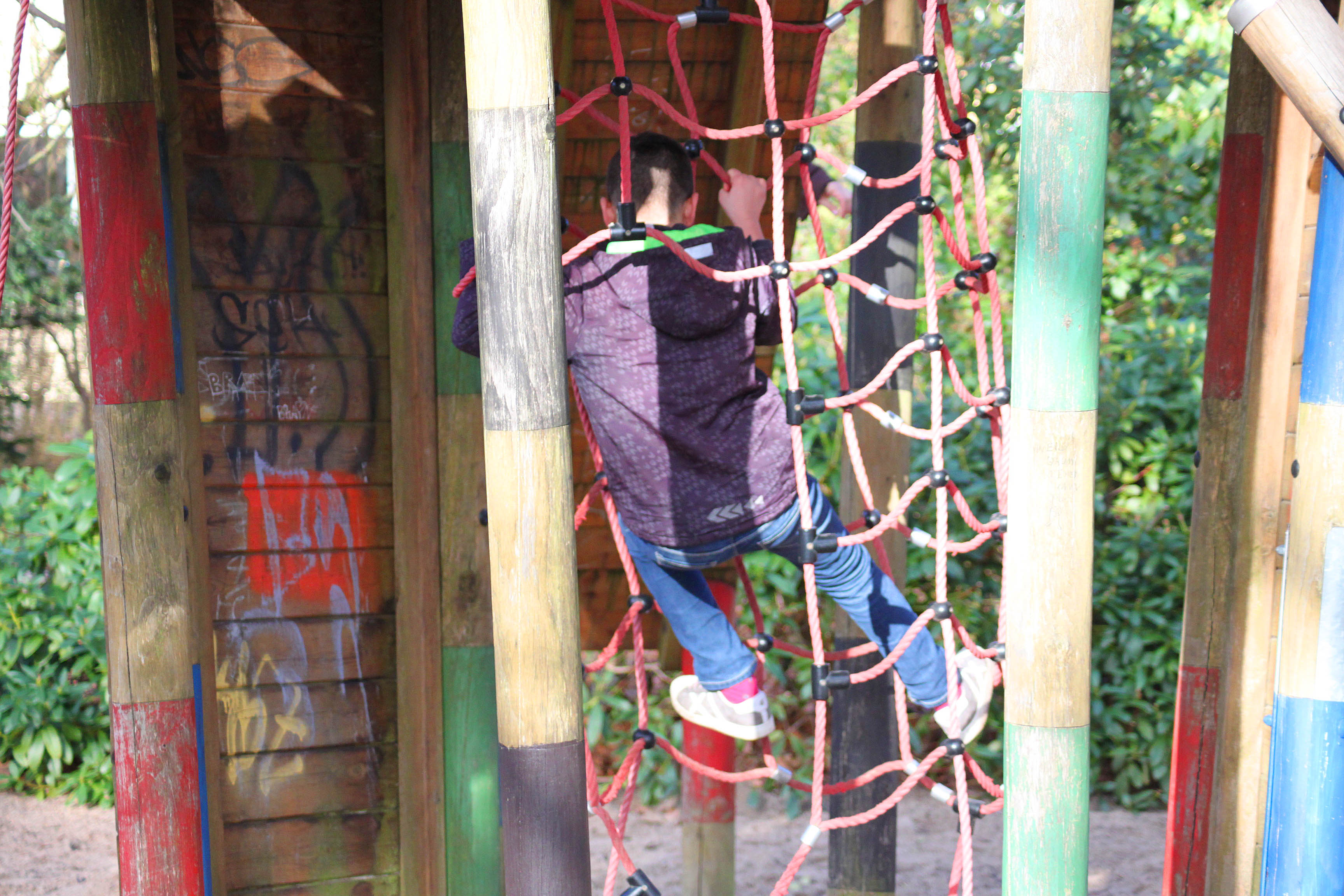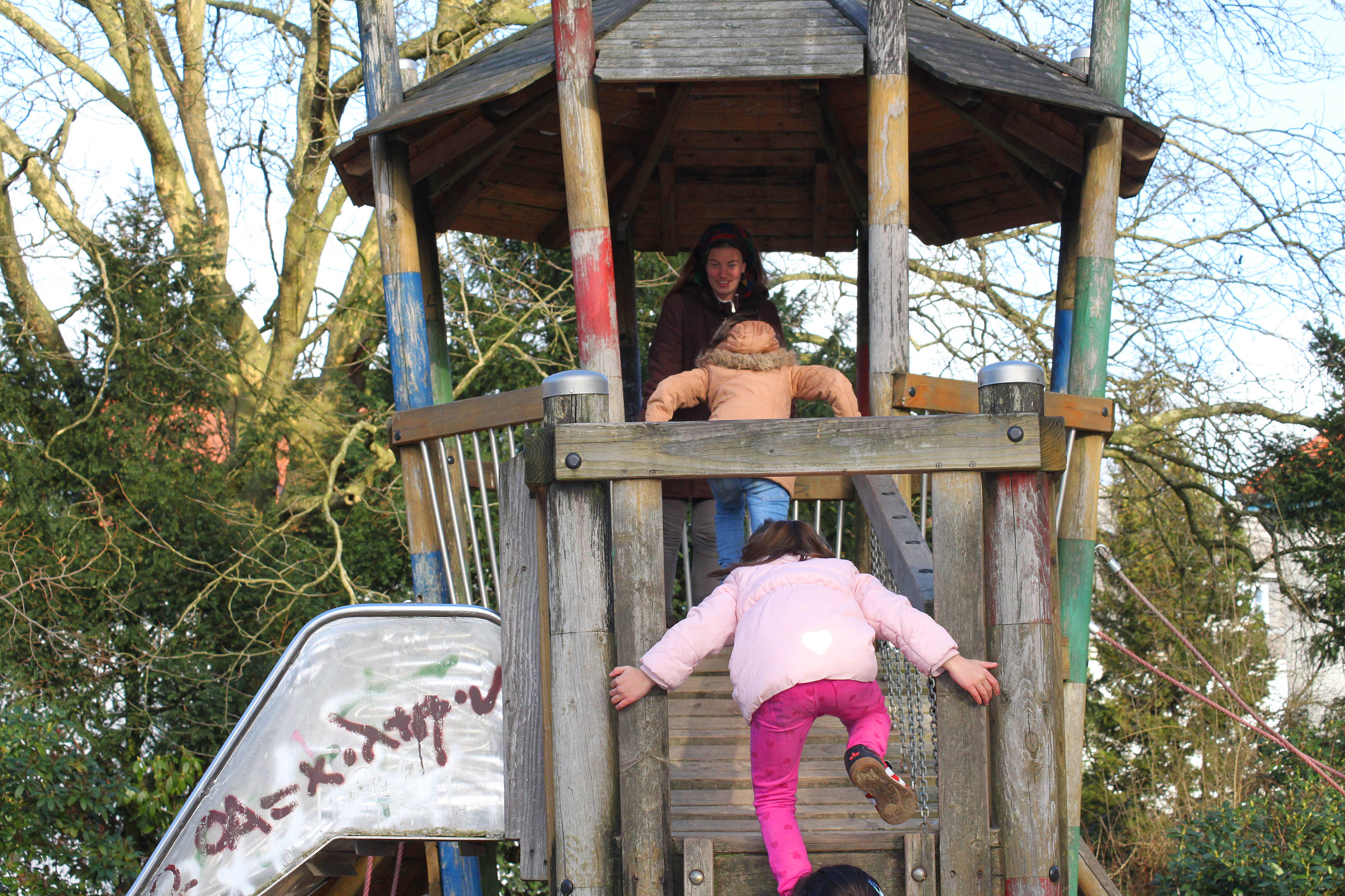 Das kleine Mädchen in der rosa Jacke steht derweil am am Klettergerüst. Amelie, komm!‘, ruft sie, grinst, und beweist anschließend gleich, dass sie heute schon was gelernt hat: ‚Amelie, komm! Los! Schneller!‘