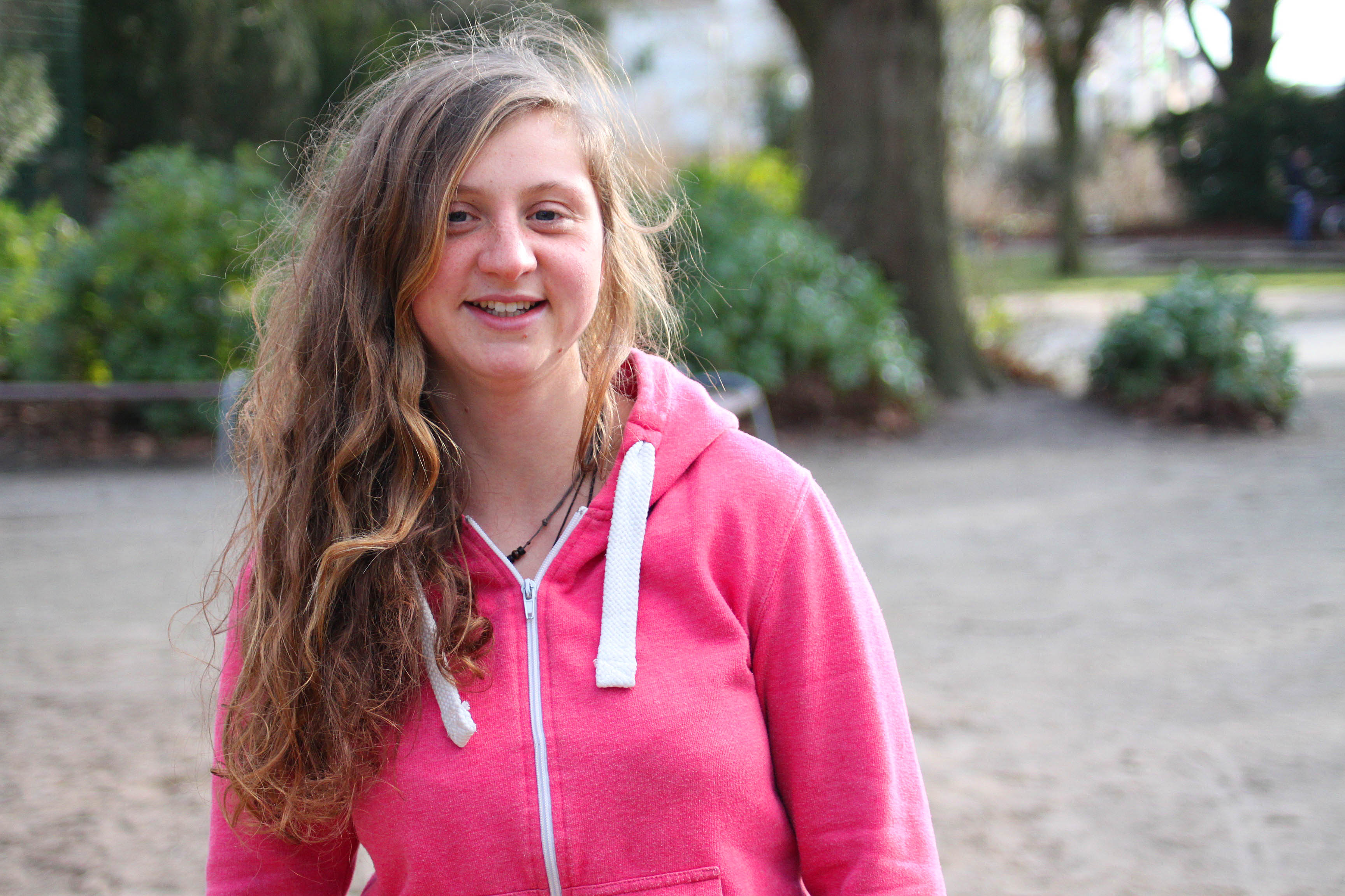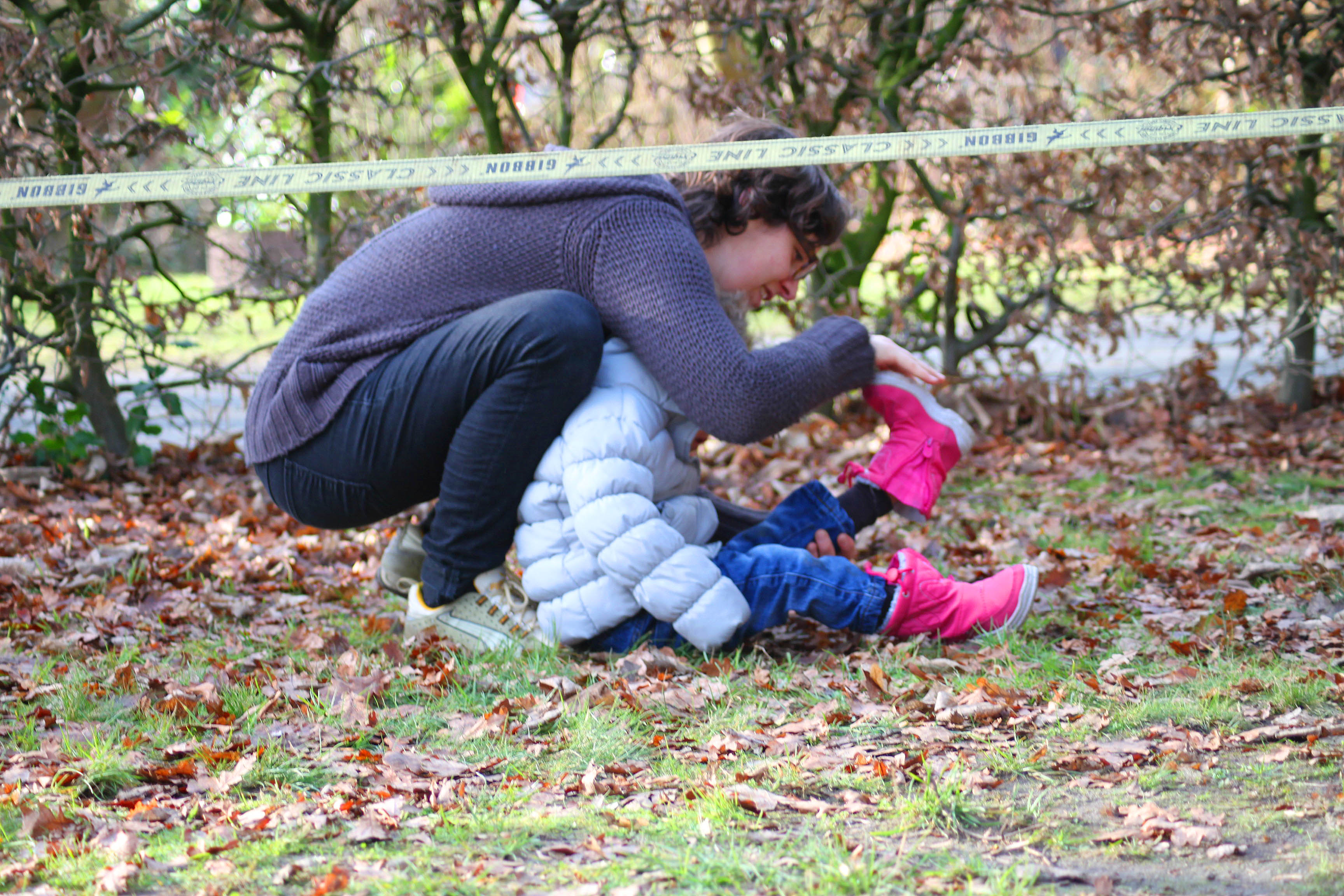 ‚Amelie, komm!‘ Das kleine Mädchen mit der rosafarbenen Jacke zieht an Amelies Hose und zeigt in Richtung Jugendherberge: Dort nur ein paar Schritte weiter, ist eine Slackline zum Balancieren zwischen zwei Bäume gespannt. Amelie geht in die Knie, schaut dem Mädchen in die Augen und sagt, sie kommt gleich. Doch die Dreijährige versteht kein Wort, strahlt sie nur an und wiederholt: ‚Amelie, komm!‘