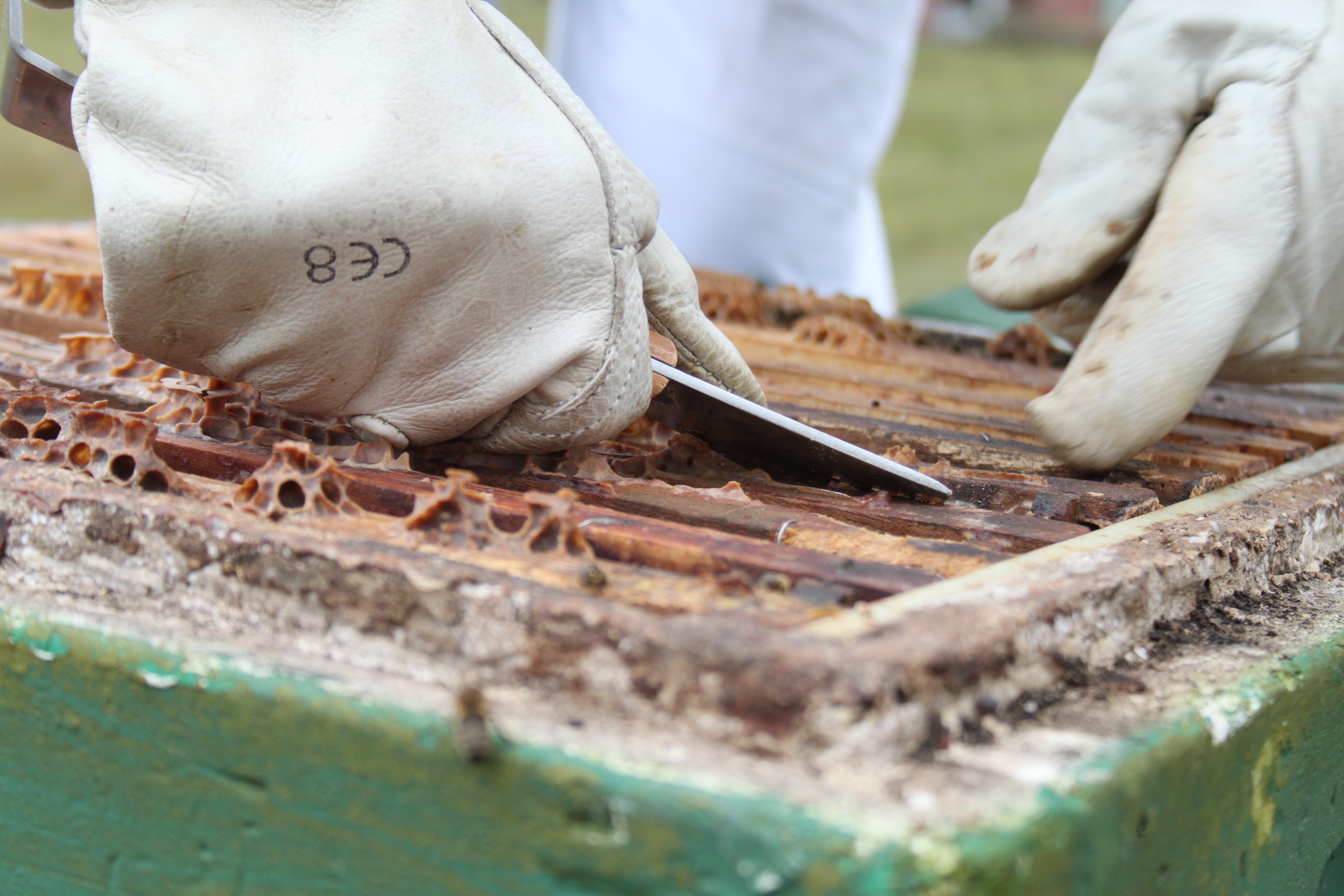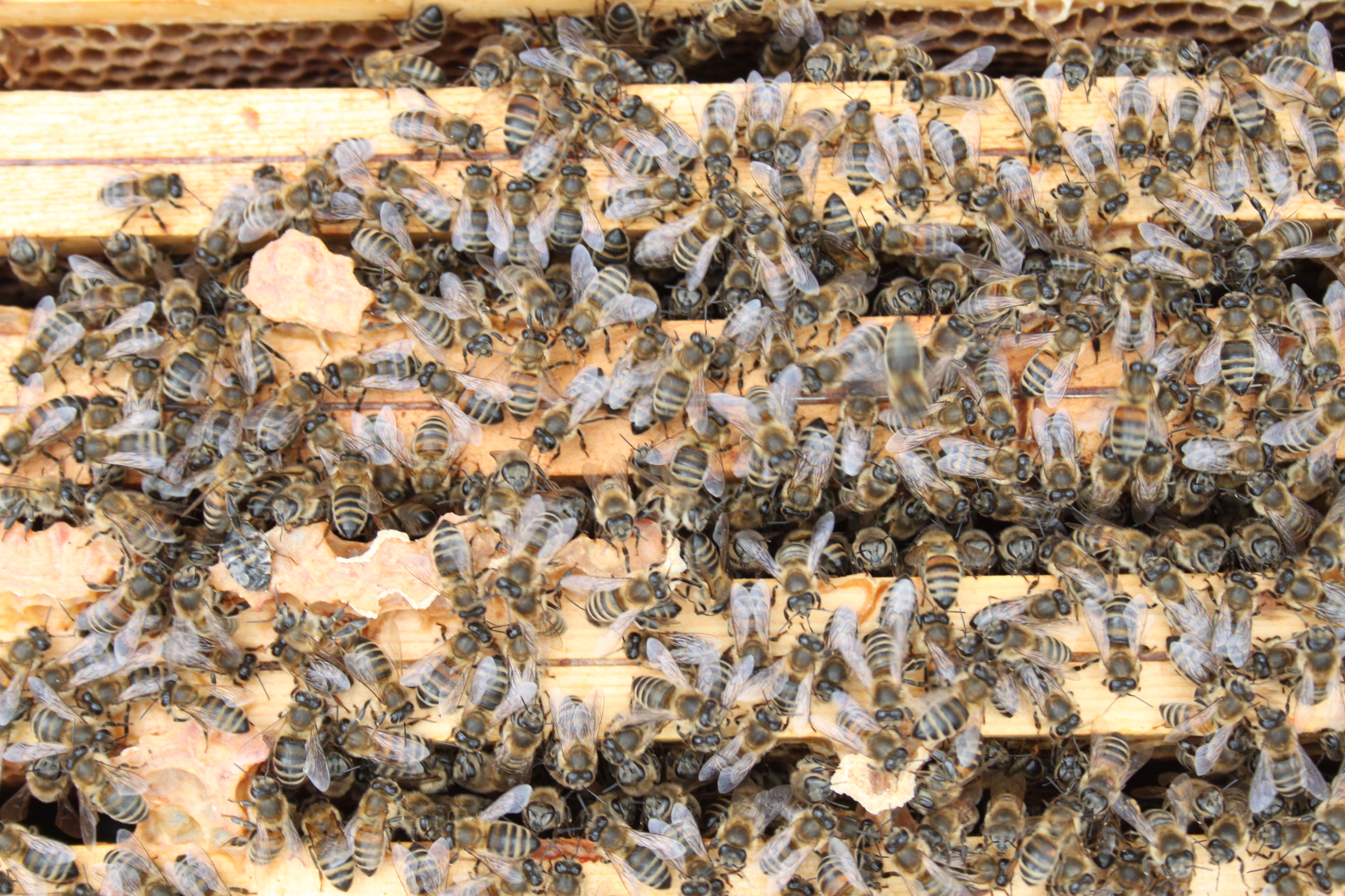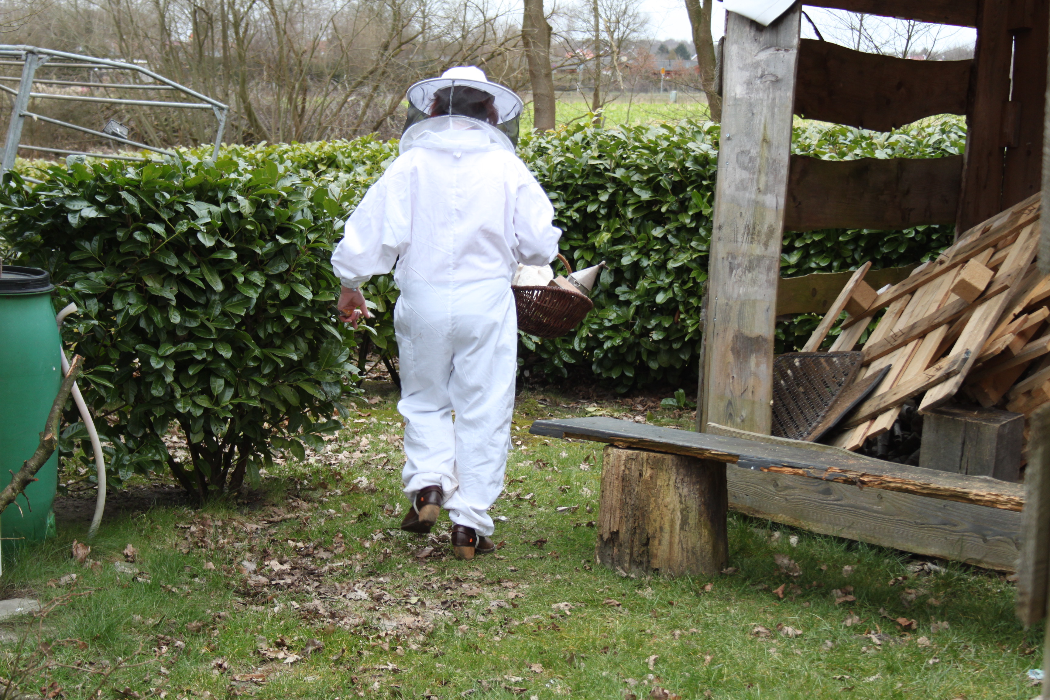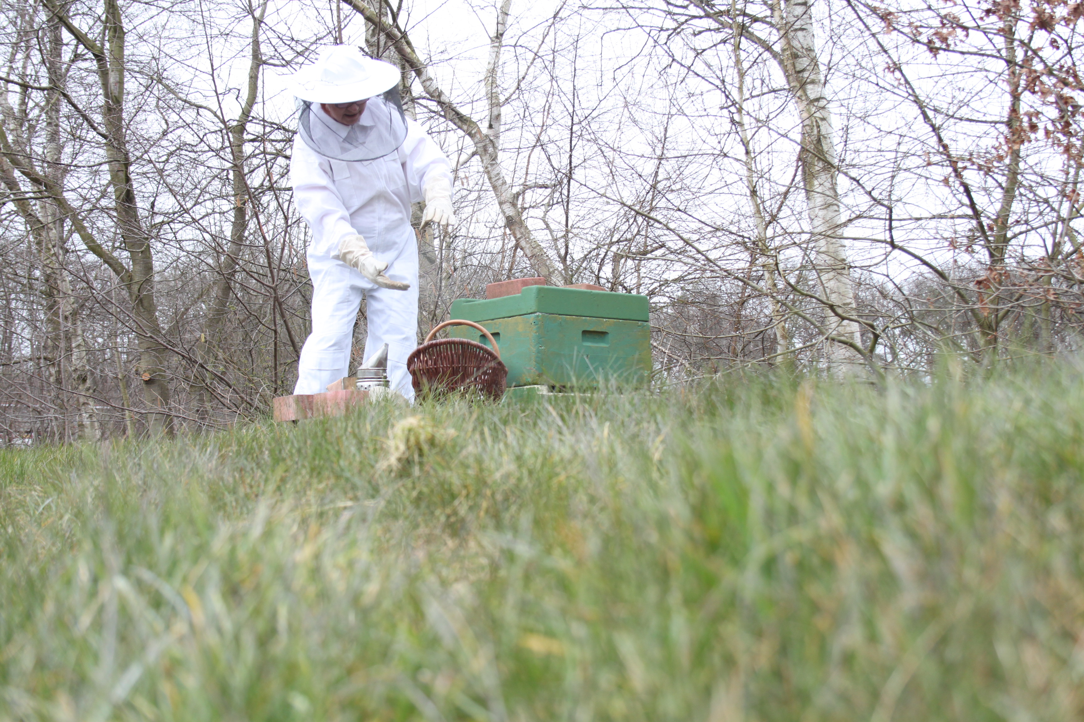 Mit einem Stockmeißel drückt Hybsz die einzelnen Rähmchen hoch, beäugt sie kritisch von allen Seiten, und steckt sie dann vorsichtig zurück in den Styroporkasten. Ja, meine Süßen, gleich lass ich Euch wieder in Ruhe‘, flüstert sie. Die Kontrolle heute ist die erste seit der Winterpause. Ich muss schauen, ob die Bienen noch genügend Nahrung haben‘, erklärt die Hobby-Imkerin. Ansonsten müsse sie mit Honig nachhelfen, damit die Insekten die Zeit bis zum Ausschwärmen noch gut überstehen. Das Wissen hierfür hat sich Hybsz angelesen. Außerdem hilft ihr ein persönlicher Imker-Pate, wenn es Schwierigkeiten gibt.