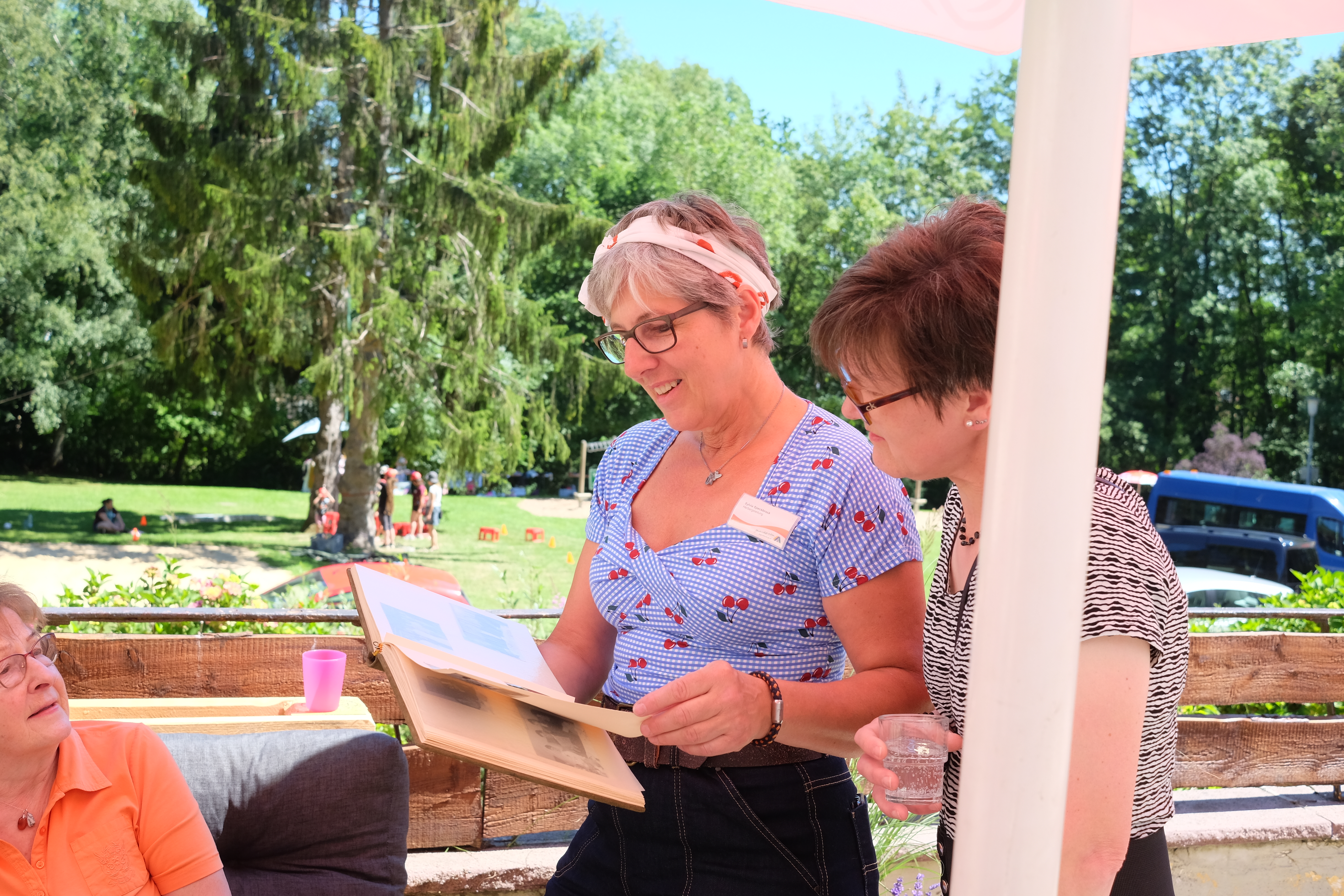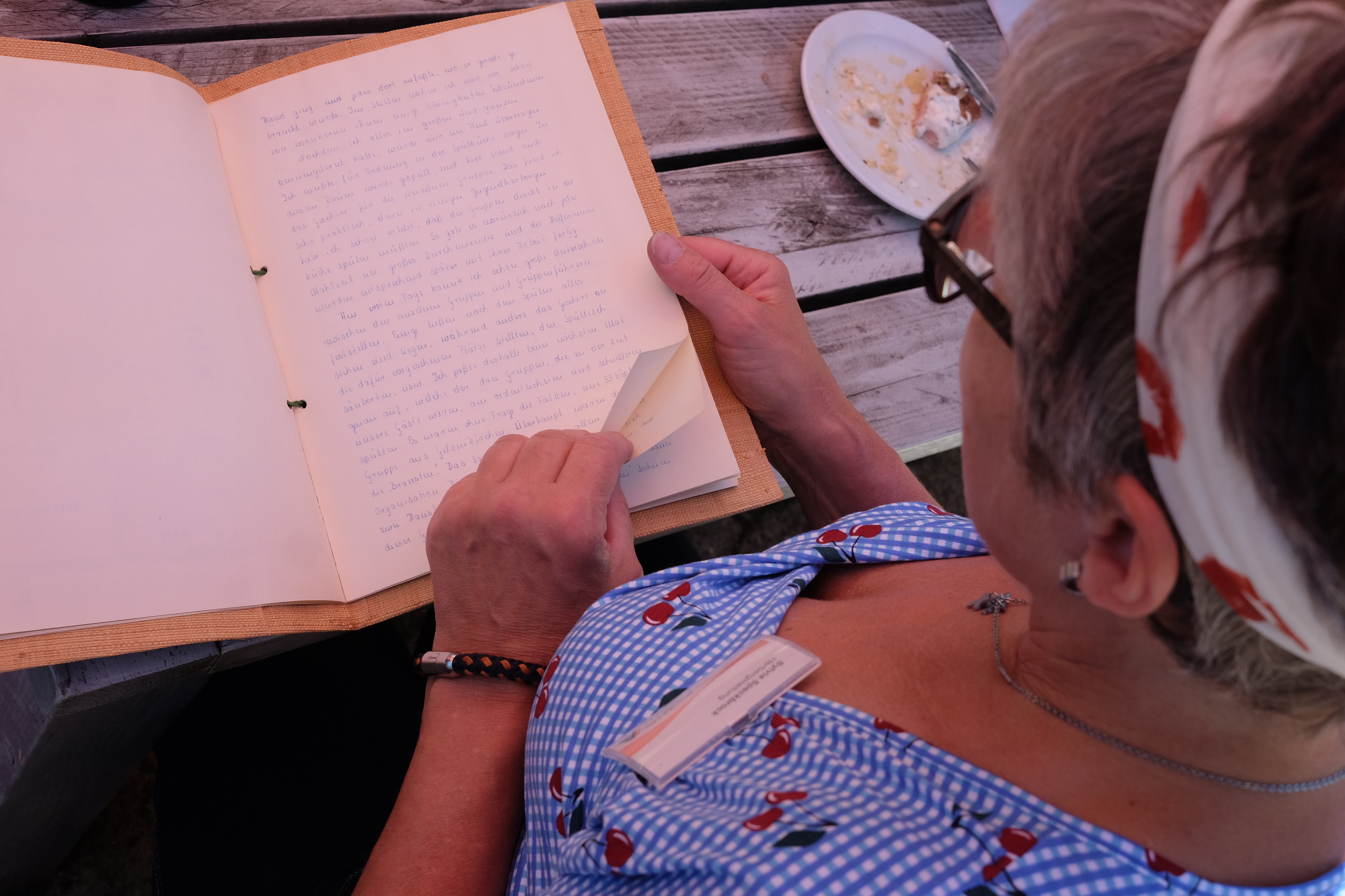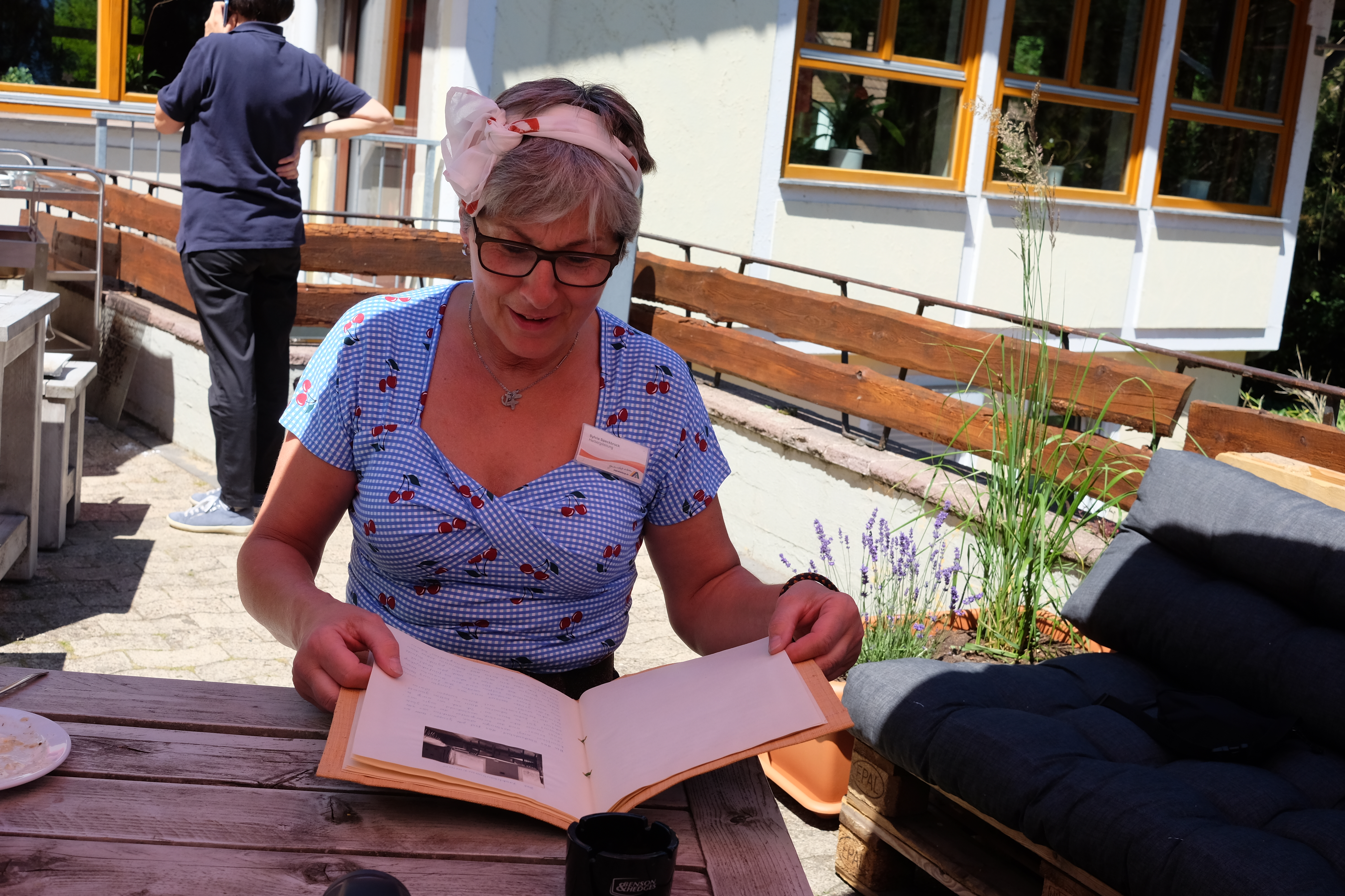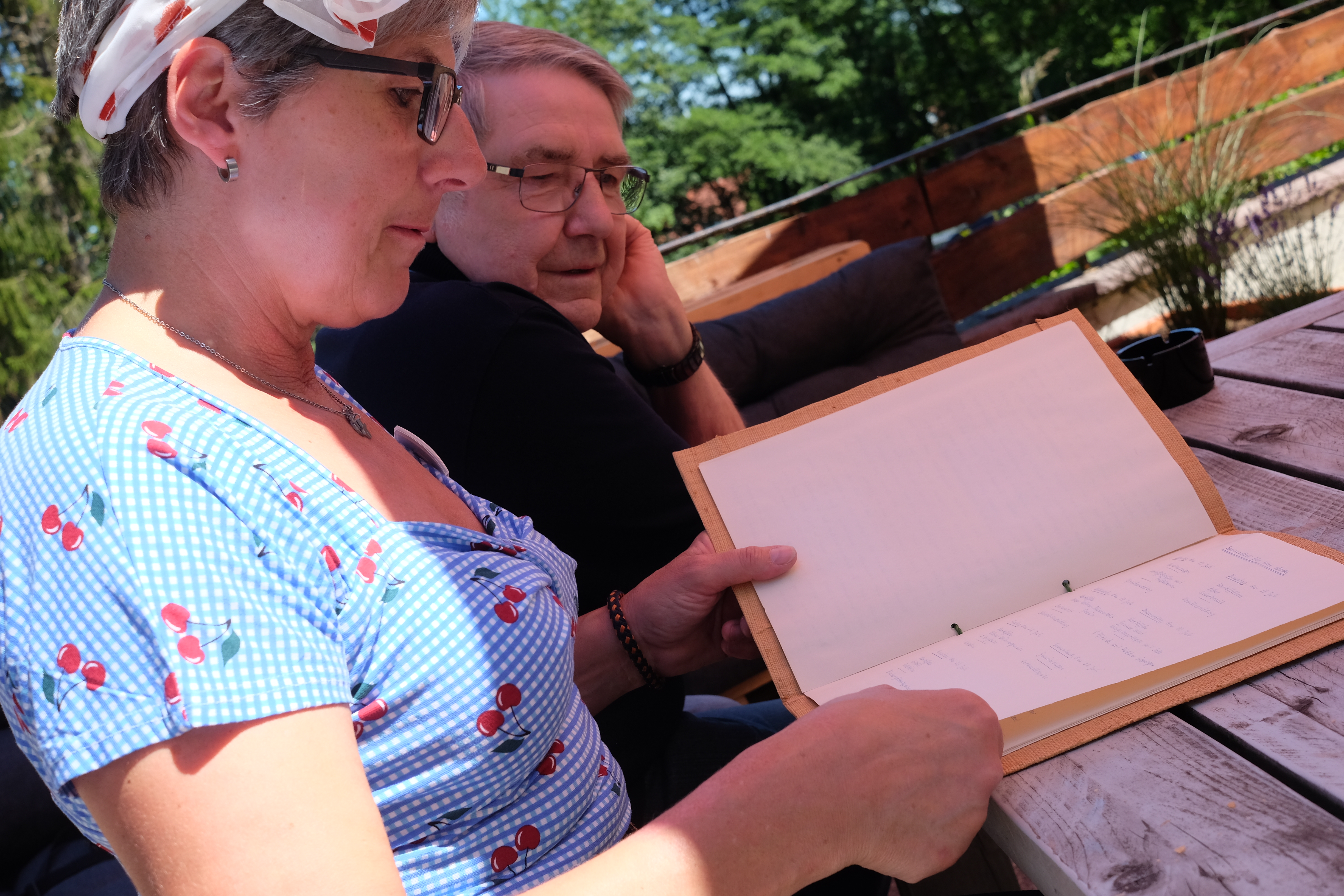 Auch Helmut Heissenberg kann sich an die ersten Jahre noch gut erinnern. Nicht, weil er damals selbst in der Jugendherberge Horn Bad-Meinberg zu Gast war – sondern weil seine Frau ihm schon oft davon erzählt hat. Ursula heißt sie, ihr Name steht in ordentlicher Handschrift auf einer vergilbten Seite in dem schmalen Buch, das Helmut Heissenberg unter dem Arm geklemmt hat. Dahinter ihr Mädchenname: Vösgen. Der Umschlag des Buches ist fein säuberlich bestickt und zeigt das DJH-Logo in grünem Kreuzstich. „Meine Frau hat sich leider nicht getraut, heute zu kommen“, bedauert Helmut Heissenberg, „aber sie hat mich gebeten, dieses kleine Geschenk vorbeizubringen.“ Mit leicht zittriger Hand überreicht der Rentner aus Horn das Buch an Sylvia Speckbrock, will dann schon auf dem Absatz kehrt machen. „Oh, das ist aber schön!“, ruft die Hausleiterin, tätschelt mit der flachen Hand den freien Platz links neben sich und blickt ihn aufmunternd an. „Setzen Sie sich doch, dann schauen wir gemeinsam rein.“