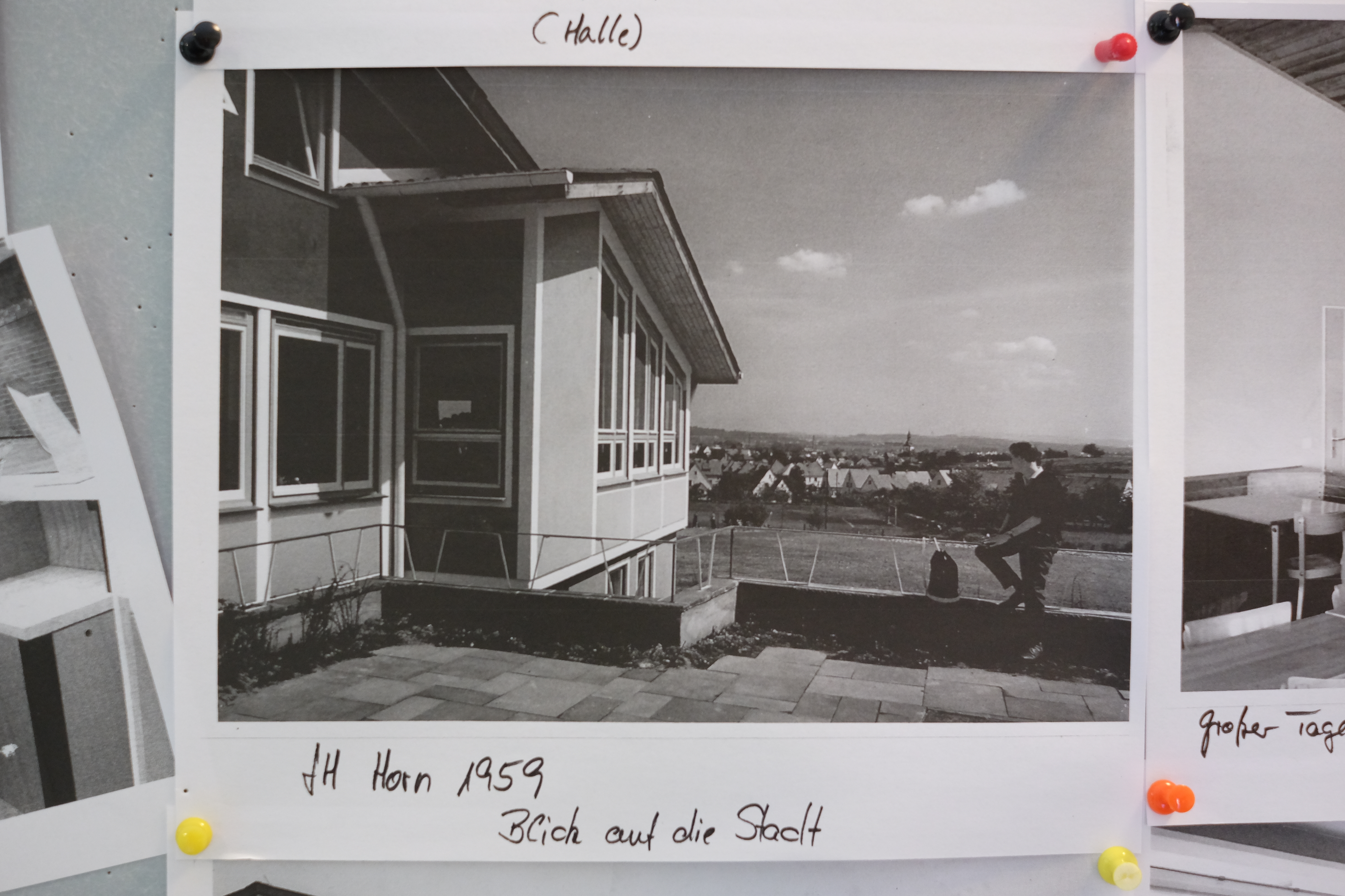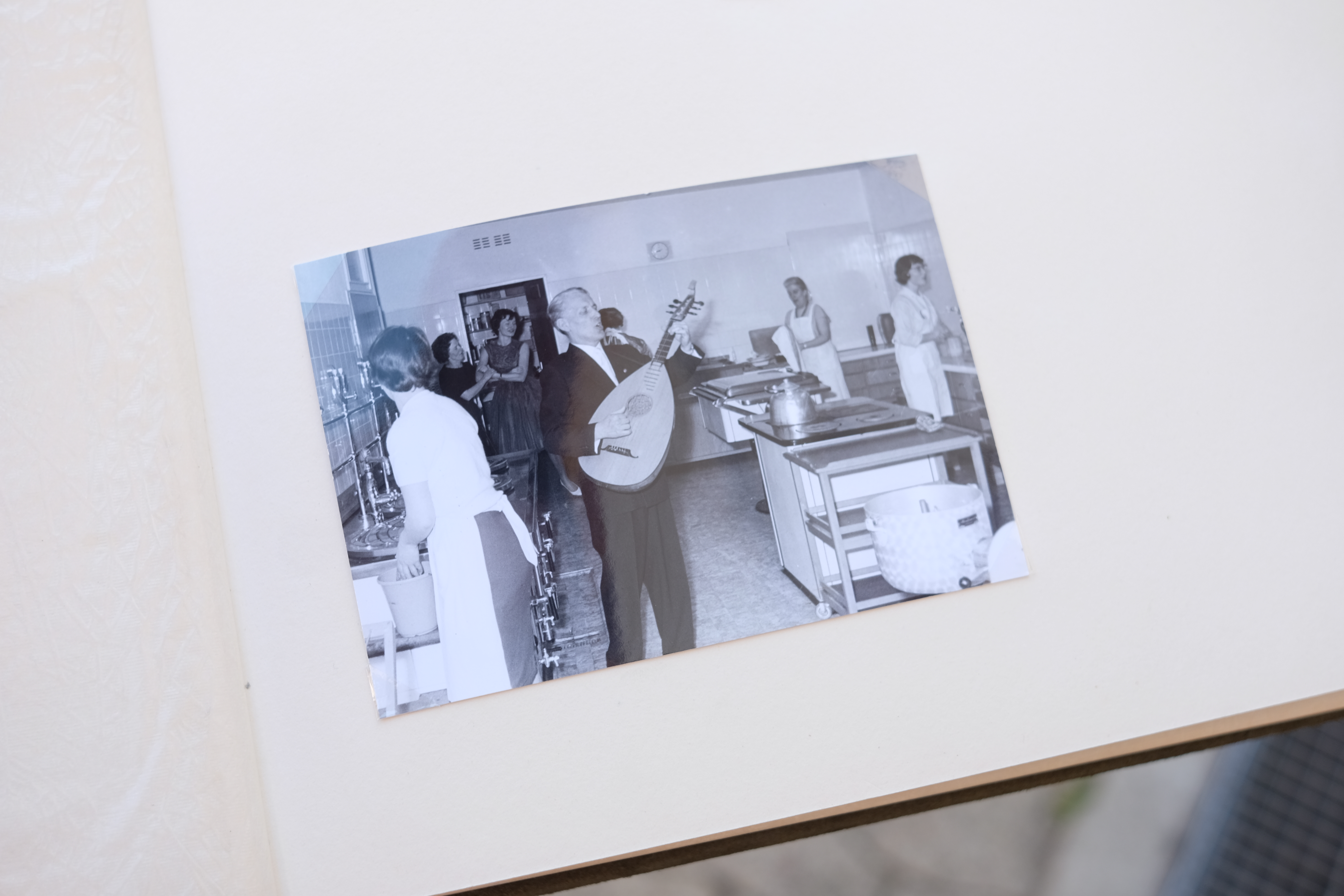 Eine ältere Dame stößt zu der Runde dazu, in der Hand ein dickes Fotoalbum. Marlis Richts heißt sie, 80 Jahre ist sie alt, und seit 1975 das erste Mal wieder hier. Früher hat sie viel Zeit hier verbracht, und einen der schönsten Tage ihres Lebens, wie sie erzählt: Im Februar 1964 hat sie ihren Mann geheiratet und in der Jugendherberge mit 40 Gästen gefeiert. „Wir hatten am nächsten Morgen nichts anzuziehen“, erinnert sie sich und lacht. „Aber Koteletts hatten wir genug.“ Hans und Gerda Cerny, die ersten Herbergseltern der Jugendherberge Horn Bad-Meinberg, waren ihre Schwiegereltern; Marlis Richts hat sie unterstützt, gekocht, geputzt, alles, was anfiel, gemacht. „Schauen Sie, hier“, sagt die 80-Jährige und tippt auf eines der Fotos. Es zeigt einen Mann inmitten der Großküche, mit Klampfe um den Hals und zum Gesang weit aufgerissenen Mund. „Das war mein Schwiegervater“, sagt sie lächelnd. „Das war immer schön, wenn wir gemeinsam musiziert haben.“ Auf den anderen Bildern sieht man sie, eine schöne Braut im langen weißen Kleid, mit ihrem Mann; wie sie die Treppe zur Jugendherberge hinaufsteigen, und wie sie zu den Zimmern gehen. Die Kleiderhaken im Hintergrund hängen noch immer. „Das gibt es doch gar nicht“, sagt Marlis Richts und schüttelt den Kopf. Das Zimmer, in dem ihre Schwiegereltern immer genäht und die Bettwäsche geflickt haben, ist allerdings ganz anders als früher: Hier stehen ein Sessel aus Sylvia Speckbrocks privater Sammlung, Sitzsäcke sorgen für eine gemütliche Atmosphäre beim Blick ins Grüne. Und da, tatsächlich: Auf einem kleinen Tisch steht eine alte Nähmaschine.