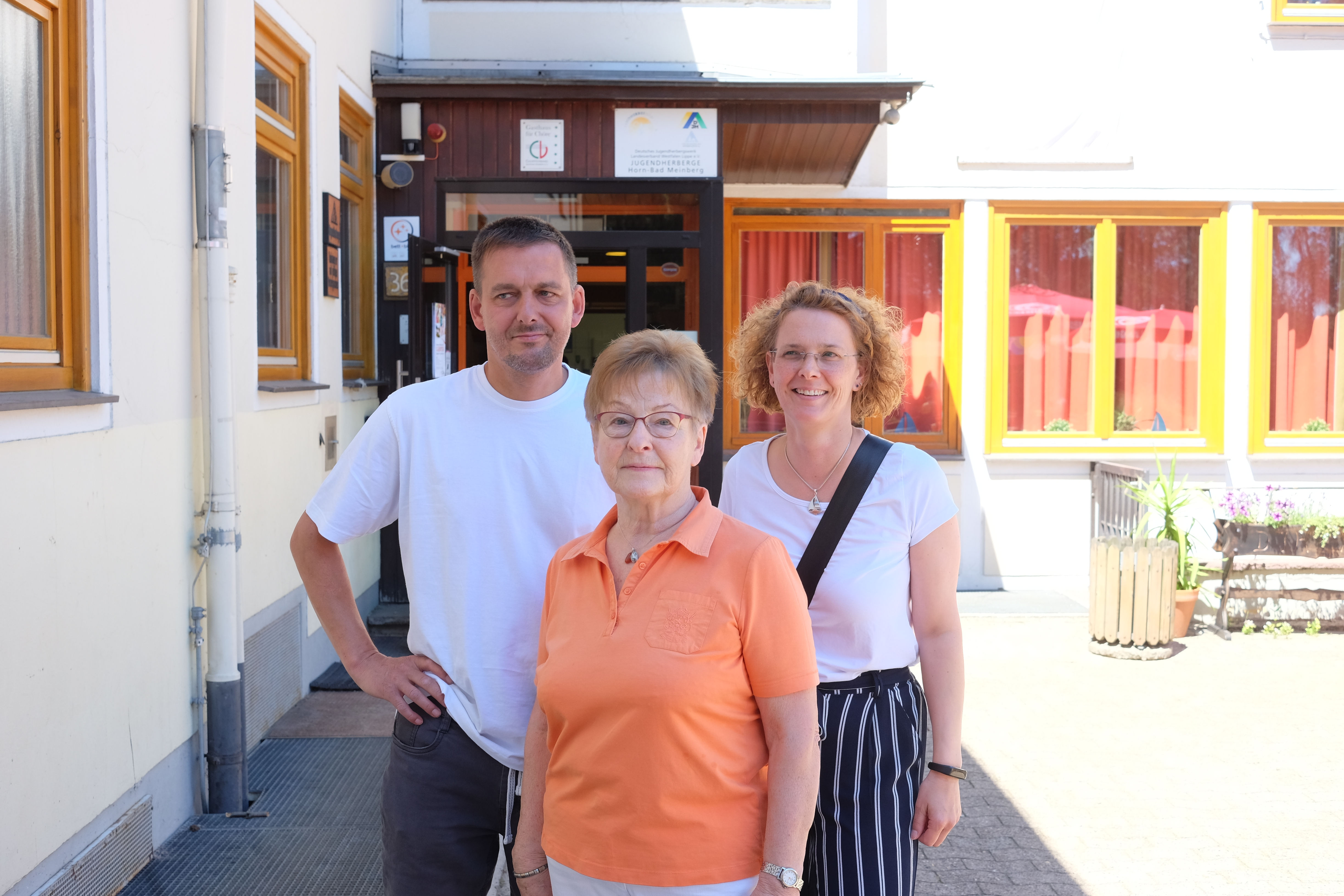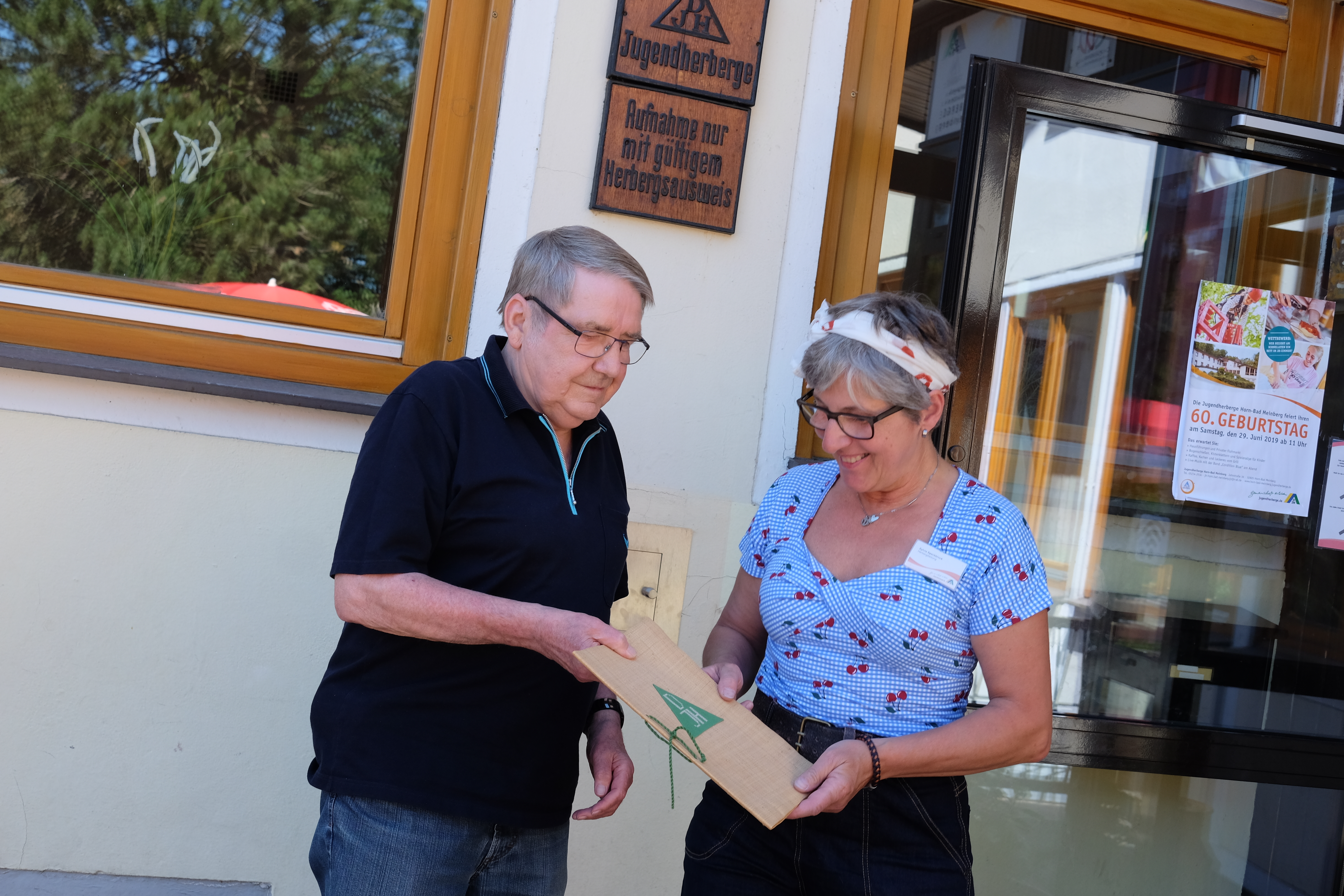 Das Ehepaar kennt sie noch aus ihrer Zeit in der Regionalleitung; gemeinsam haben sie damals Besteck in der Jugendherberge Bad Driburg poliert – daran erinnern sie sich jetzt, draußen auf einer der Palettenbänke auf der Terrasse. Von 2010 bis 2017 waren Hilde und Calle Swoboda für die Leitung des Hauses zuständig; mittlerweile ist es ein Jahr her, dass sie zuletzt gemeinsam zu Besuch waren. „Jedes Mal, wenn wir wieder hier sind, fällt uns auf, wie wunderschön die Jugendherberge gelegen ist“, sagt Hiltrude Swoboda. Ihr Mann kommt etwas öfter hierher, macht beispielsweise Fahrten mit seinem Chor oder seiner Konversationsgruppe Französisch nach Horn Bad-Meinberg. „Im Winter ist es besonders traumhaft“, schwärmt Calle. „Wenn die Externsteine voll weißem Reif sind – das hat schon etwas Magisches.“ Obwohl er das Haus eigentlich bis ins Detail kennt, entdeckt er immer wieder Neues. „Hier hat sich einiges getan“, sagt er. „Sylvia hat hier vieles verändert, sehr gelungen.“