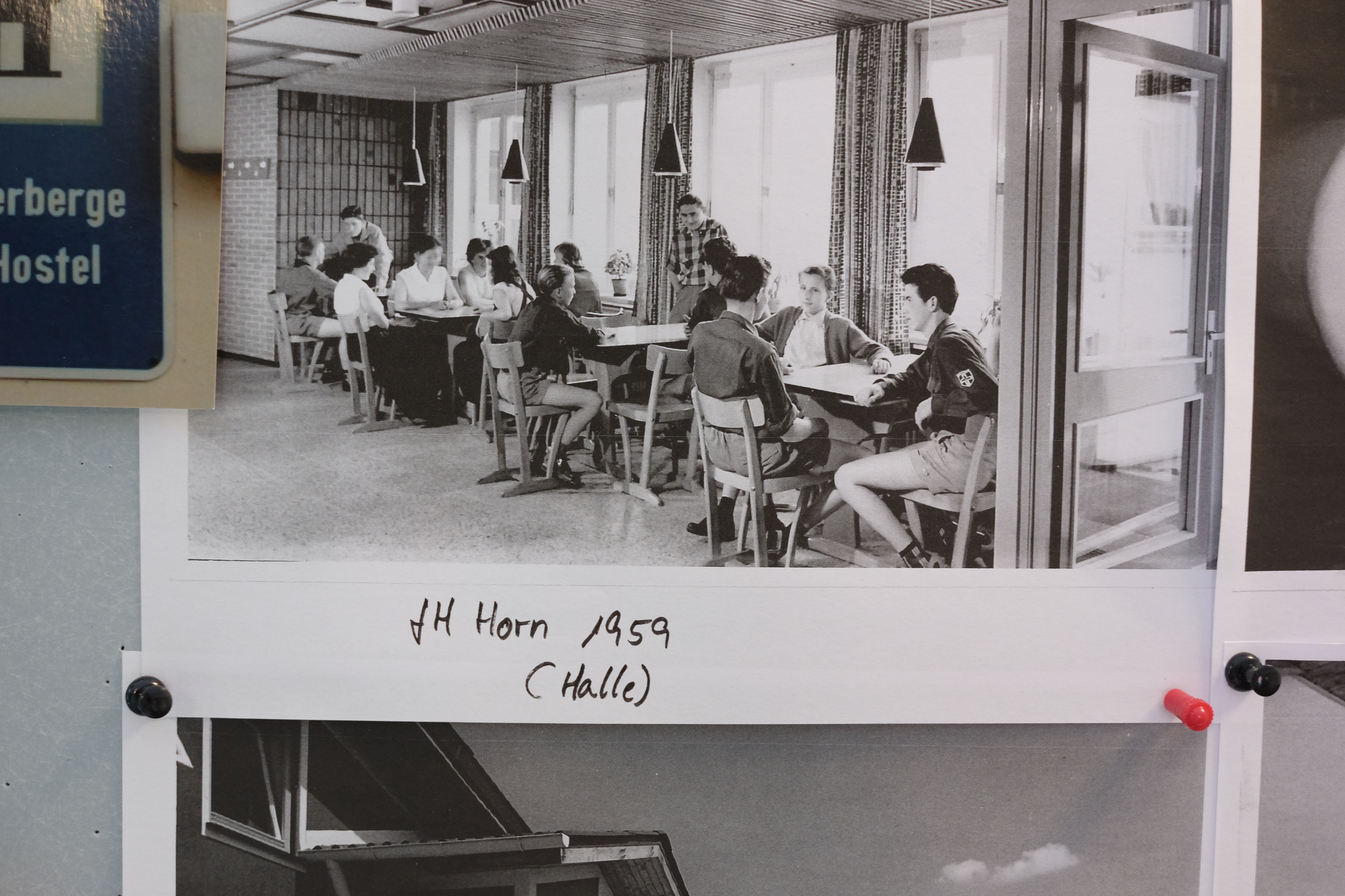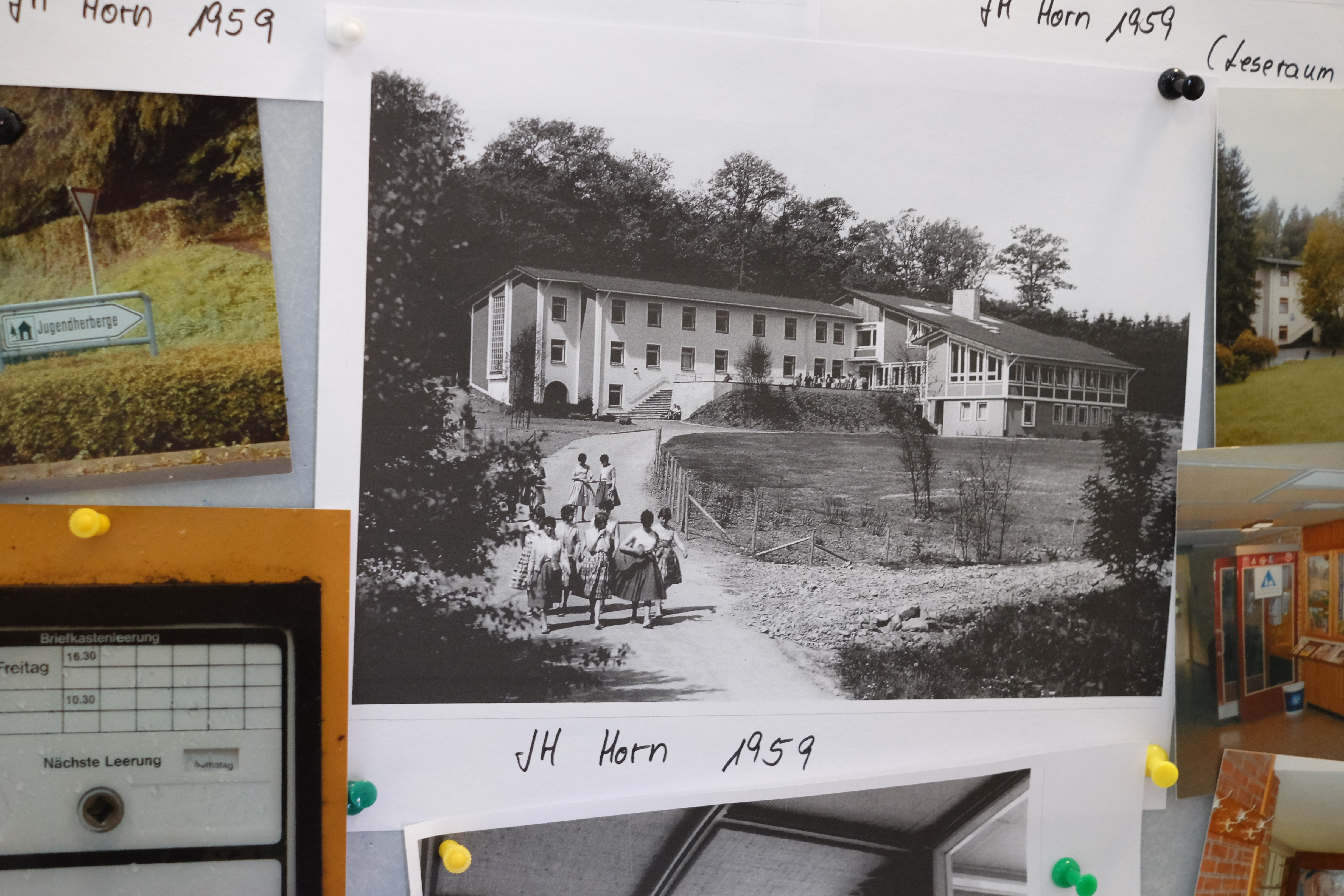 Anneliese Tülle steht davor, betrachtet eines nach dem anderen. Geht ganz dicht heran, berührt mit ihrer Nasenspitze fast die matten Schwarzweiß-Aufnahmen, die dicht an dicht an einer Pinnwand befestigt sind. Die 92-Jährige hat damals den Baufortschritt miterlebt, war zur Eröffnung des Hauses dabei und anschließend regelmäßig zu Gast. „Meine Tochter hat hier immer viel und gerne gespielt“, sagt die Seniorin, die noch immer nur ein paar Straßen weiter unten, direkt hinter dem Sportplatz, ihr Haus hat. Sie strahlt. „Das war eine herrliche Zeit. Nein wirklich, das war herrlich.“ Mittlerweile ist ihre Tochter selbst 62 Jahre alt, einiges hat sich verändert. Auch die Jugendherberge? „Ja, natürlich“, antwortet Anneliese Tülle. „Aber vieles ist noch so, wie ich es in Erinnerung habe.“ Die Decke in der rustikalen Empfangslobby, zum Beispiel, ist original erhalten geblieben aus dem Gründungsjahr.